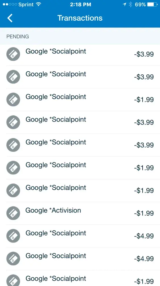 Several times since last night and way early in morning today. Check your accounts and make sure this doesn't happen to you. Had to close card and get a new one. Check you accounts early in morning because they do this while you sleep. So need money recovered by google since it all starts with them. Hopefully the other folks will get their money back too