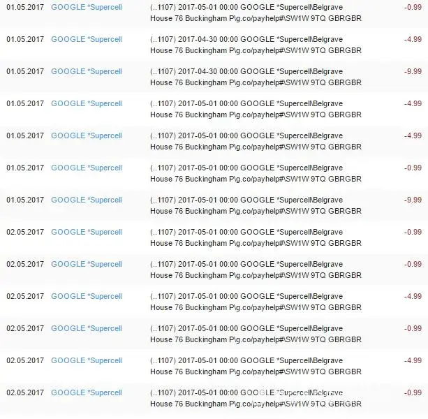 I've been charged almost 30 times 30.05, 1.05 and 2.05.2017. the text on bank says: [protected]:00 GOOGLE *SupercellBelgrave House 76 Buckingham Pg.co/payhelp#SW1W 9TQ GBRGBR