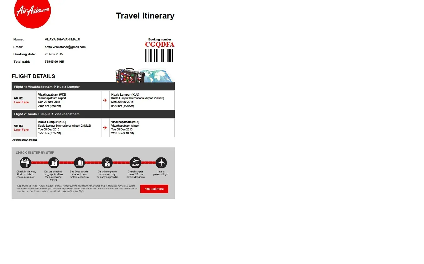 Respected CEO or Head of Google, I along with my 5 family members including 2 children of about 9 and 10 years age have booked air asia flight ticket on 29th Nov 2015 onward journey and return ticket on 6th Dec 2015. However, on 6th Dec morning we have received an Google update that airasia flight is delayed by 4 hours (00:55 AM ETD) and hence accordingly we reached the airport by 9:30 PM to check in and board the flight. However, when we reached the checkin desk the lady at the counter said our flight has left by 7:55 PM. This was a shocking and panicking situation for me as I had to report to work the next day and my baby to school. When we showed the update received through Google your employee at the counter said it was not from airasia and hence cannot take any responsibility for that. When I asked about a solution she said there is other flight till 8th Dec 2015 and that too we need to pay 1000 ringgets (INR 17000) additional amount as penalty to reschedule our booking to 8th Dec 2015. How can Google send updates without the information from air aisa airlines?. Just imagine the trauma for a single parent like me and all the 5 of us who were supposed to reach India, visakahapatnam by 6th Dec night. We had no place to stay and had to rush out at the middle of the night at 12:00am back to kaulalampur. As we had no money left with us and all 5 of us, we literally stayed on roadside for next 2 days with the 2 kids. This has left me and my family with bitter taste and I can never forgive for what was done to us by incorrect update on flights of air aisa by Google. There are some more victims like this on the 6th Dec 2015. Ever since we missed the flight there were multiple repercussions and emotional disturbances and nightmares for the 2 kids who were accompanying us as they missed the school the next day and were traumatised about any punishment at school. My daughter even till date gets up in the middle of the night and screams in her sleep "mummy, we are going to miss the flight" run run, "Teacher will punish me". I had to reschedule my travel to Hyderabad (within in India) for important visit, by cancelling the train ticket and book a flight ticket (INR 8000) and take my daughter along with me as she was emotionally disturbed with the whole incident and could not leave her behind in Visakhapatnam. I have no option but to file a case against google for what I and my family especially the 2 little children had to go through which left them with trauma. I feel responsible to notify you with my intention hence this complaint mail. I am attaching my itinerary for Malaysia trip and also my spice jet flight ticket as the impact evidence. Sincerely, Vijaya Bhavan Majji [protected]@yahoo.co.in +[protected] P.S. I am unable to attach the complete itinerary as this form does not support pdf file format. only picture formats.