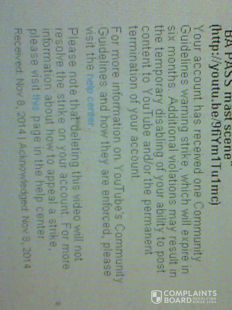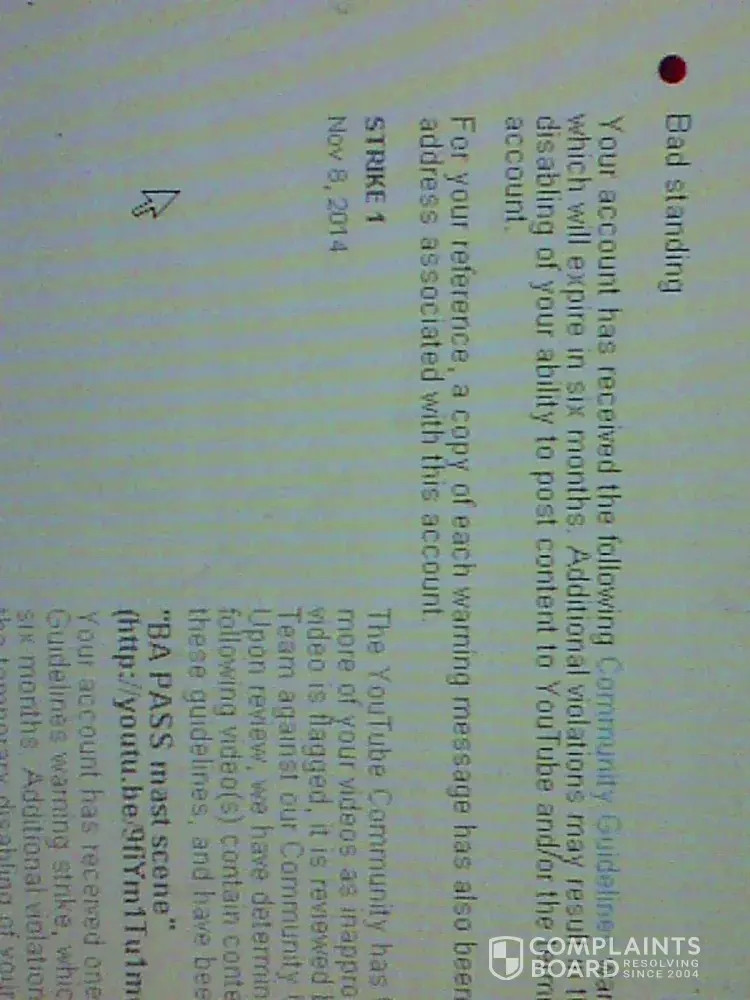 I received a strike on my youtube account on November 8th, 2014 regarding one of my videos titled " BA Pass mast scene" which contained a non explicit Bollywood movie BA Pass sex scene, permitted and far less vulgar by the standards of other such youtube videos. But I still deleted this Video and requested youtube admin via feedback to remove the strike and restore my account to Good standing again, as I need to upload some videos which exceed 15 minutes length, a feature which is currently blocked in my account due to bad standing. But these people have a policy of the strike expiring in 6 months and I find it very annoying to wait for 6 long months to get my account in good standing, so that I can continue my work. Despite several attempts by me to request them to restore my account to Good standing, they have not even responded to my feedbacks, leave alone taking favourable action on my requests so far. Please take strict action against Youtube and get my account restored to Good standing. Now I do not have any nude or objectionable Video content in my Channel, please visit https://www.youtube.com/channel/UCNiWh-dqBH7IKxBJ4s2IJUA to verify my claim. And the youtube is partial also, other users have uploaded full BA Pass movie and they are not being flagged down, visit https://www.youtube.com/watch?v=r51mlHAcEIY, https://www.youtube.com/watch?v=ZFC78XMGBC0, https://www.youtube.com/watch?v=ZT2ir5HzdRk, https://www.youtube.com/watch?v=3f9V3Ym-Oqo and many more links like these. So the question arises that are the rules only meant for me ?! Please take strict and immediate action against Youtube and get my account restored to Good standing asap.Please find the proof photos in attachment.