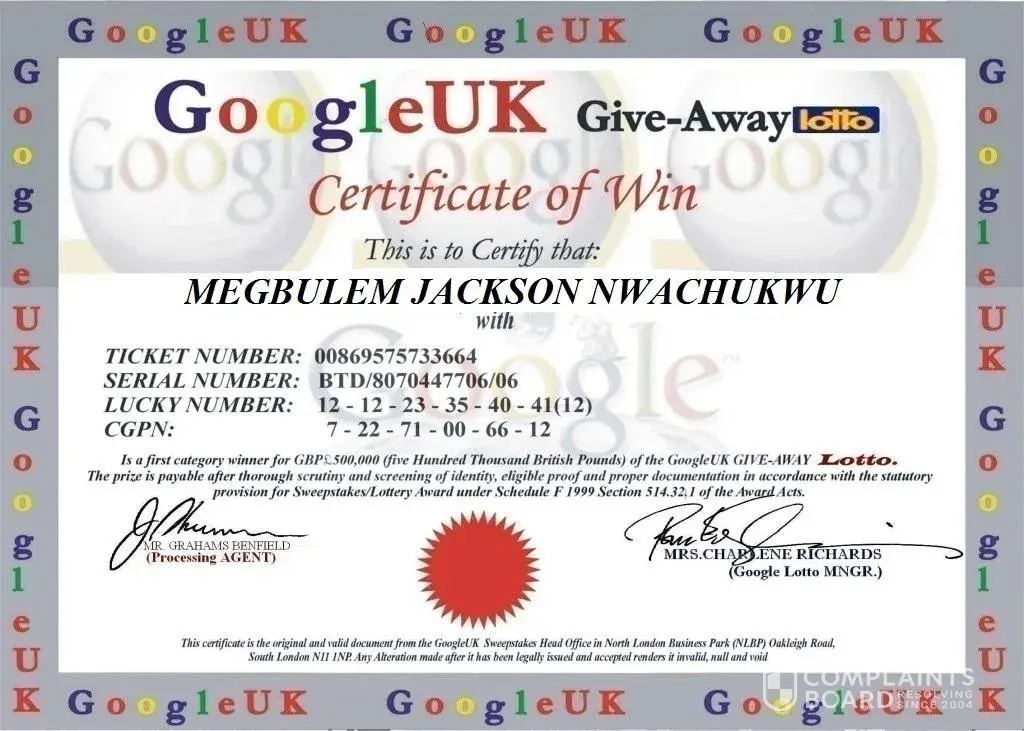 The google promotion award team has discovered a huge number of double claims due to winners informing close friends relatives and third parties about their winning and also sharing their pin numbers. As a result of this, these friends try to claim the lottery on-behalf of the real winners. The google promotion award team has reached a decision that any double claim discovered by the lottery board will result to the canceling of that particular winning, making a loss for both the double claimer and the real winner, as it is taken that the real winner was the informer to the double claimer about the lottery. So you are hereby strongly advised once more to keep your winnings strictly confidential until you claim your prize.