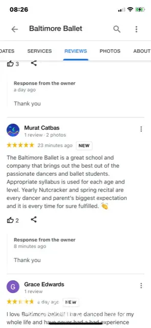 My students, parents, dancers and I have photographs proving that Google may have been blocking close to all positive reviews while generating/allowing negative reviews from unbeknownst accounts for Baltimore Ballet School and Company. We also have proof that Yelp has been practicing similar strategies as well.