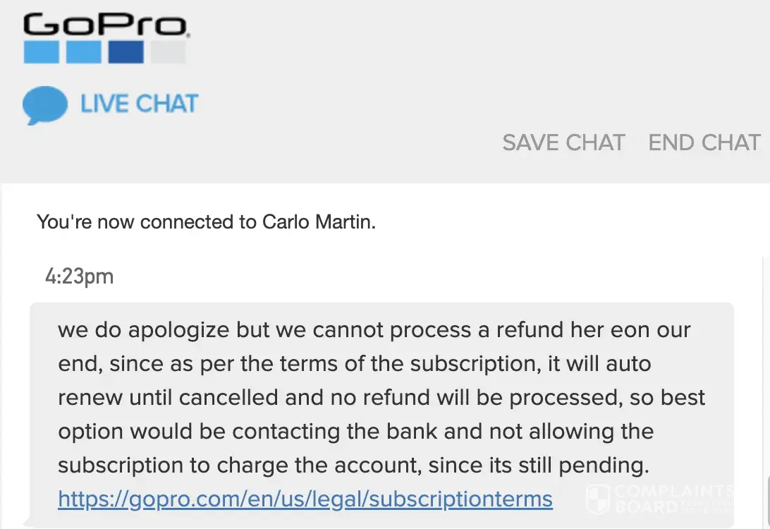 I bought a new GoPro 3/29/2021 and then was charged $49.99 for a GoPro subscription on 3/29/2022. I canceled on 3/30/2022 when I noticed the charge, and GoPro said they can't refund me and now I don't even get the GoPro subscription either. The charge is still pending on my bank account, so I informed GoPro of that in order to show how quickly I canceled after being charged. But they had the audacity to say "we dont process refunds for it, best option is that if you do really need the refund, you can file a dispute on the bank."