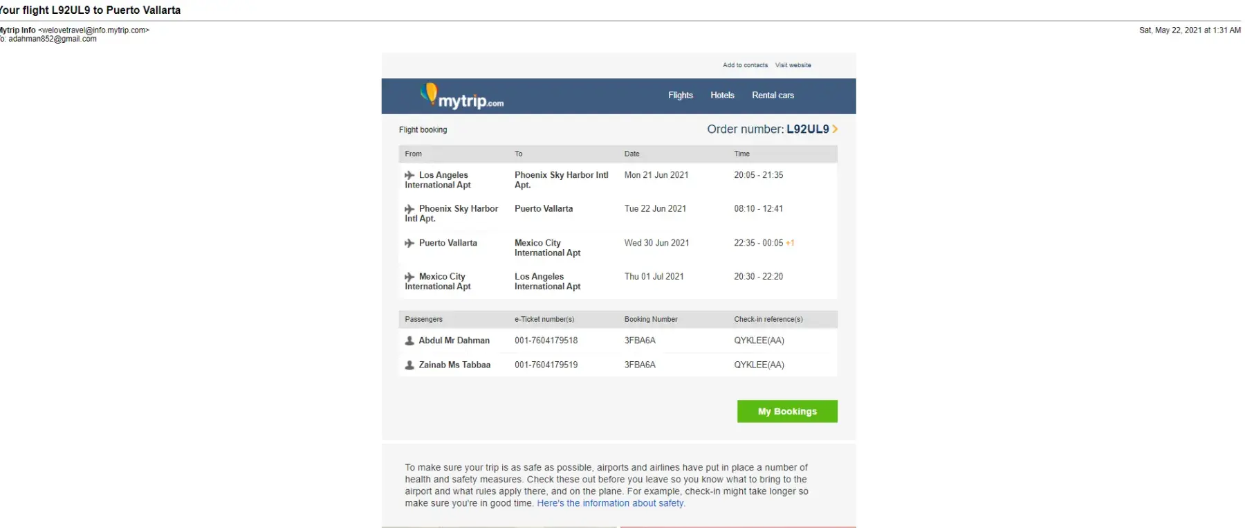I'm attaching the emails I sent, and the original itinerary.
