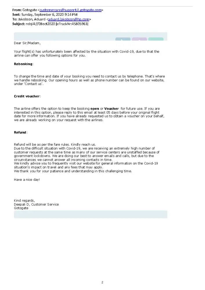 On September 6th 2020 GoToGate sent me the standard email with a suggestion to replace my tickets with one of the following: rebooking, credit voucher, or refund.
