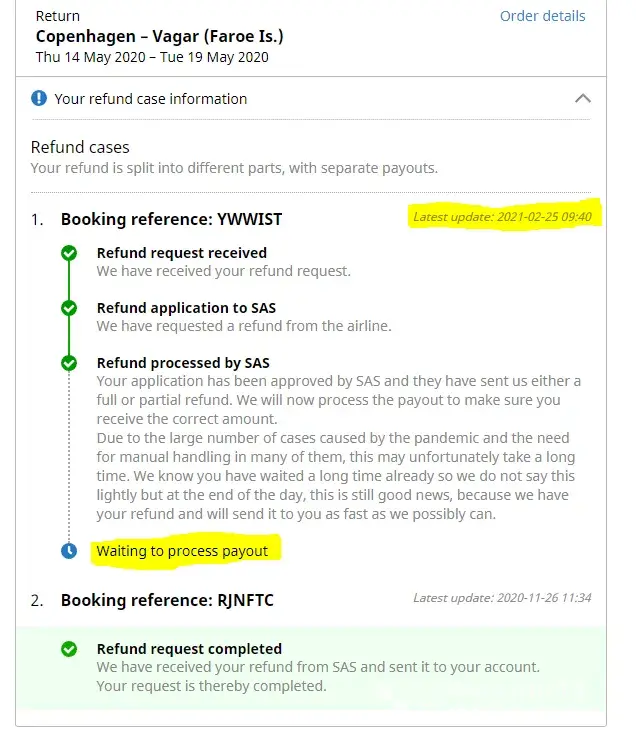 Due to the pandemic, my flight has been canceled. I had to call customer services to apply for a refund. A few months later, on 26th of November 2020, I've received the refund but only for one of the flights (Copenhagen - Faroe Islands).