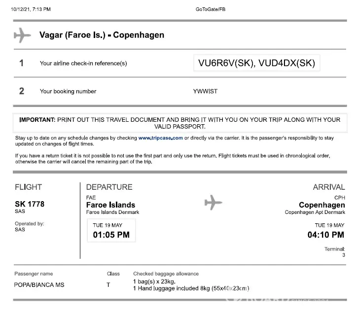 In February 2020 I purchased a plane ticket from Copenhagen-Faroe Islands and return, flight operated by SAS airline. I bought the ticket through the intermediate company Gotogate.