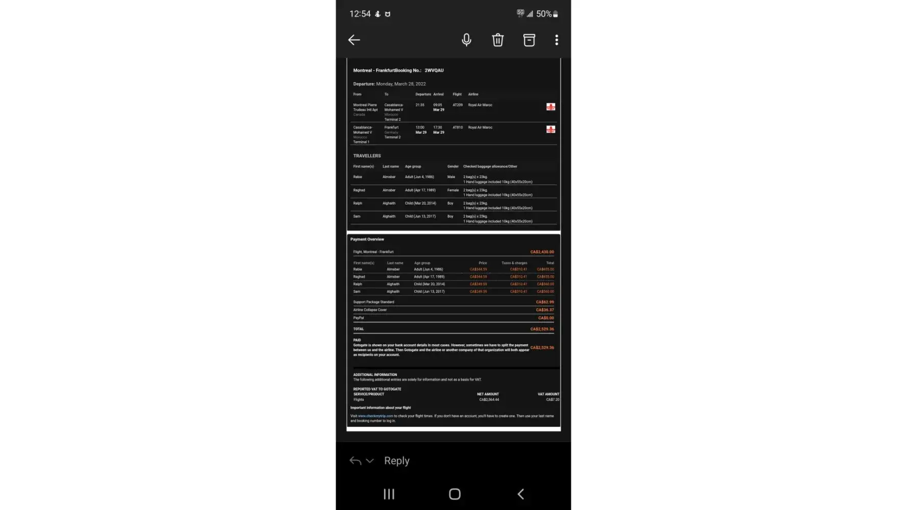 Surely you have a breakdown of what ahs been charged to your customers. The breakdown you send us is not detailed enough and does not give us the breakdown of the flights for each leg of our journey or what the baggage payment was for each part of the Journey.