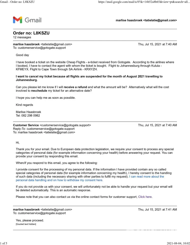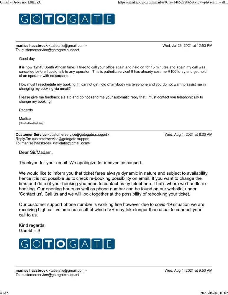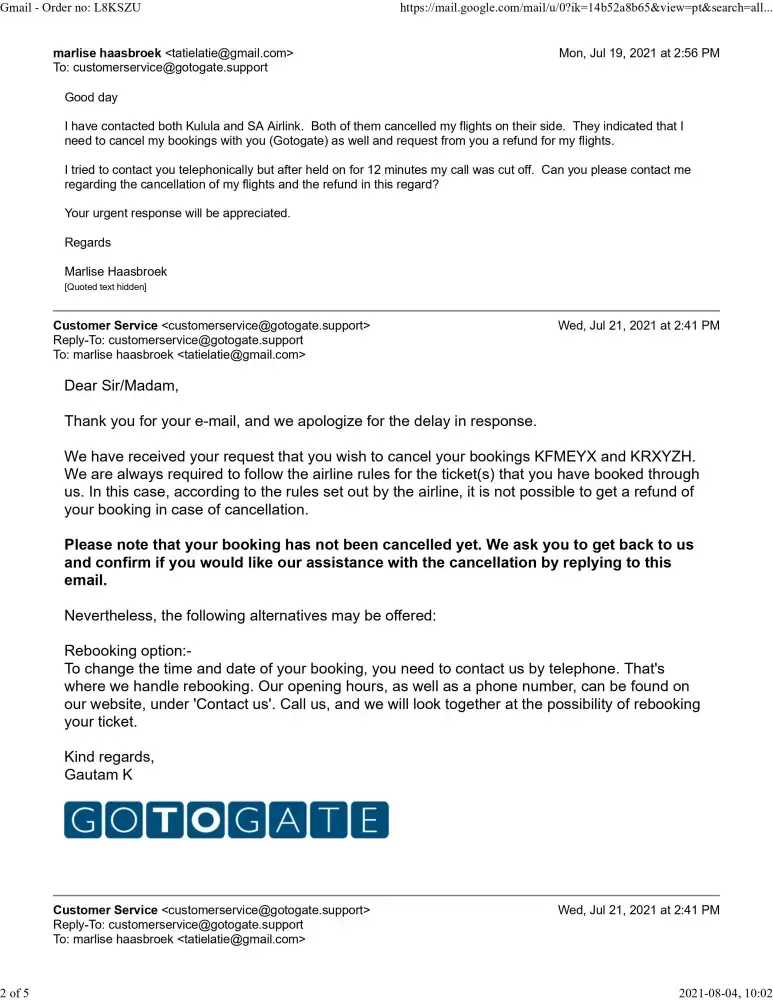 Mijn vlucht werd gecanceld wegens covid. De luchtvaartmaatschappij betaalde gotogate maanden geleden terug, maar gotogate stort het geld niet door. Ik kan hen nergens contacteren : "mijn boeking" herkent mijn reservatie niet, alle telefoonnummers van europa heb ik geprobeerd ofwel zijn ze buiten gebruik ofwel krijg jee een bandje "we helpen u zo dadelijk". Als je mailt krijg je een automatisch antwoord "je boeking is 60 dagen oud en dus geen I info meer beschikbaar"... Het gaat over 2 business vluchten van 4000€ die gotogate schaamteloos achterhoudt. Enige mogelijkheid zal de rechtbank worden. Boek nooit meer met gotogate!