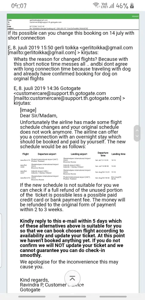 Received a message about flight changes made by airline and got an offer from gotogate that they can offer me flight with exactly same flight but 1 day later than i orgibally booked . I answered to the email and agreed with the changes but after that i havent get any messages from gotogate about my flights over 36h and they are not answering to any emails and their customer servise is a total scam was at the queque for 3hours and no one dont pick up the phone. Tryed to call again after 36h the same [censored] goes on.
