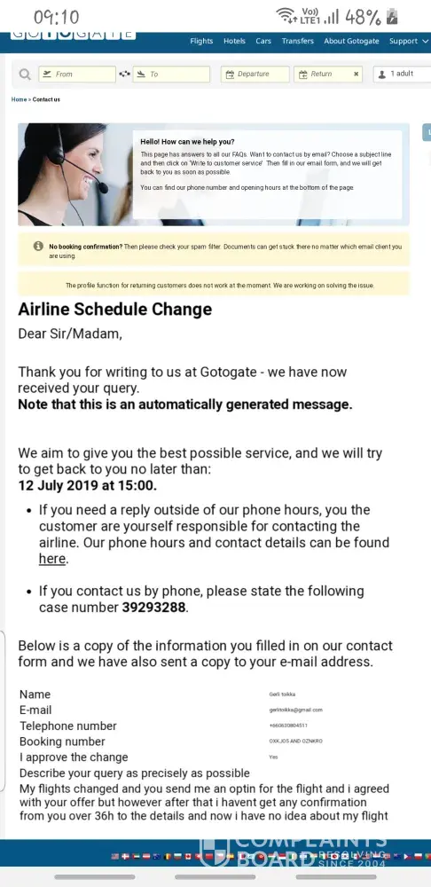 And filling at gotogate website the form gettind automatic answer that they try to get back to me in less than 24 before my orginal fligts and that not ok..
