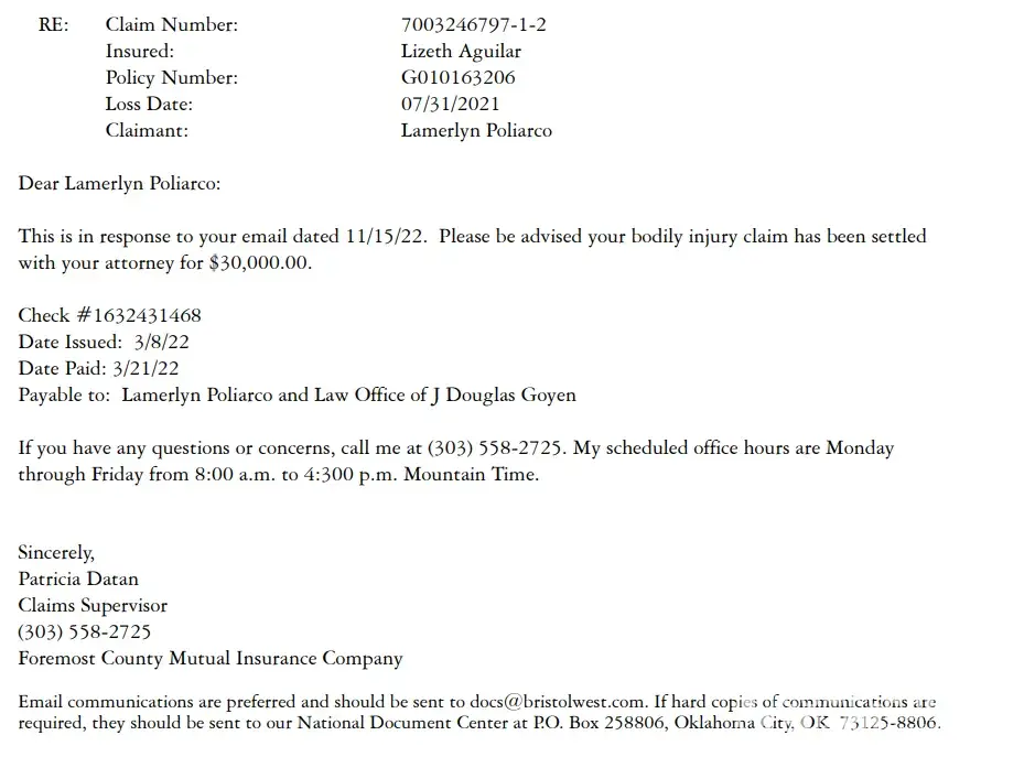 I was involved in a car accident last July 31 of last year. I hired Atty. Doug Goyen as my representor and according to the other parties insurance they send him a the check for my total damage worth of 30,000.00 on March 21, 2022 and my insurance paid my car for 28,193.00 on Sept. 09, 2021. The last time I talked to my attorney was on May 4, 2022 when he...