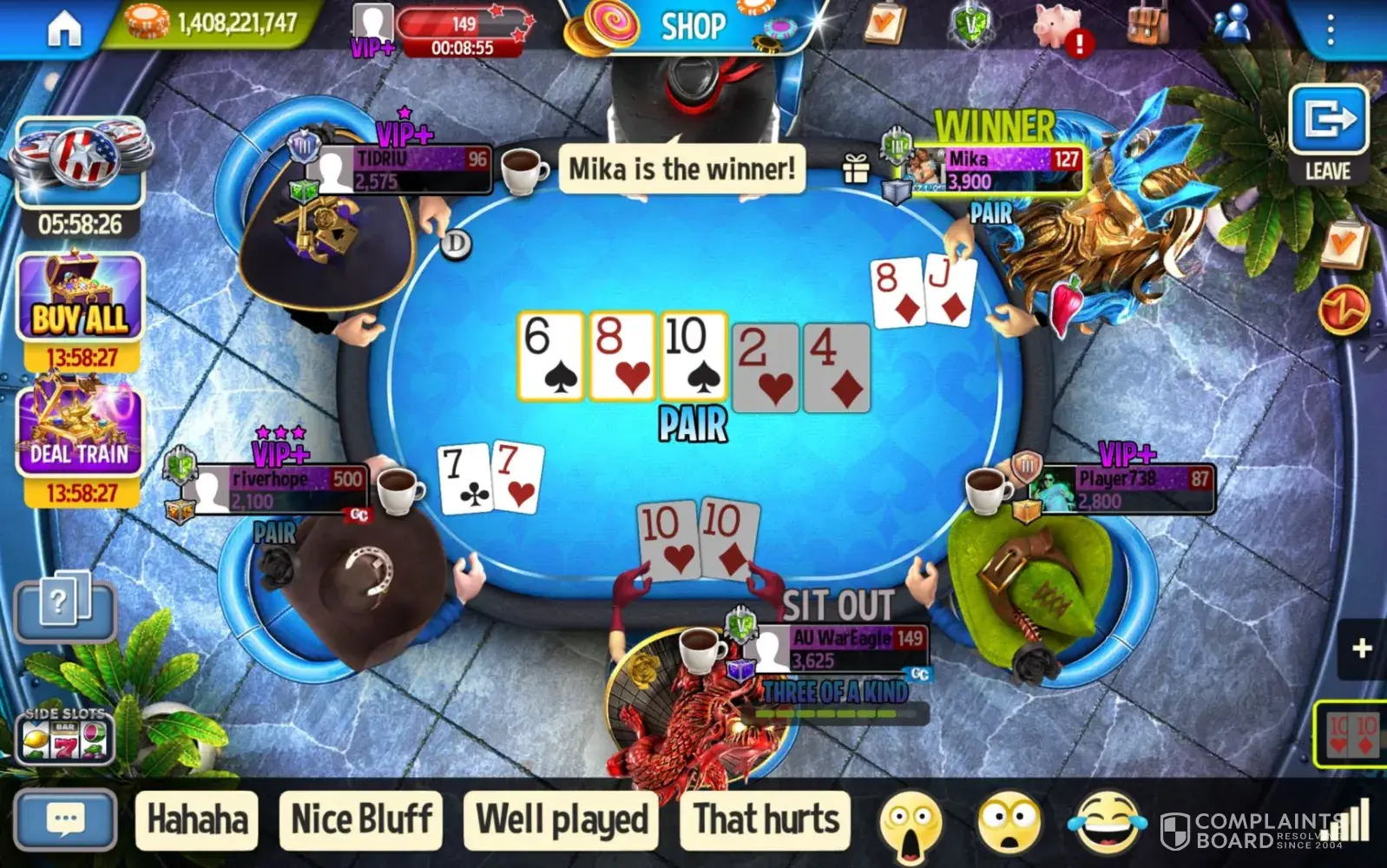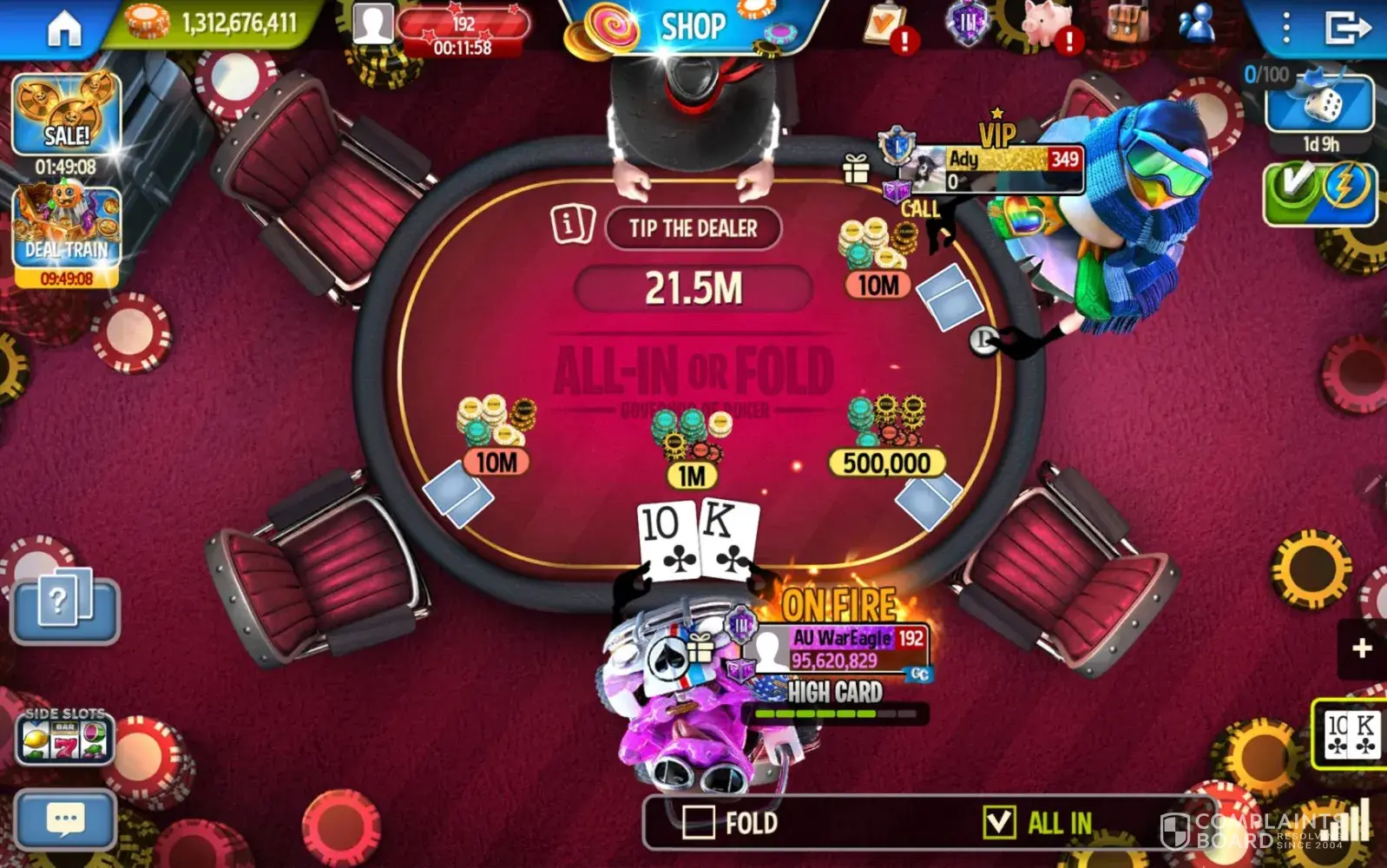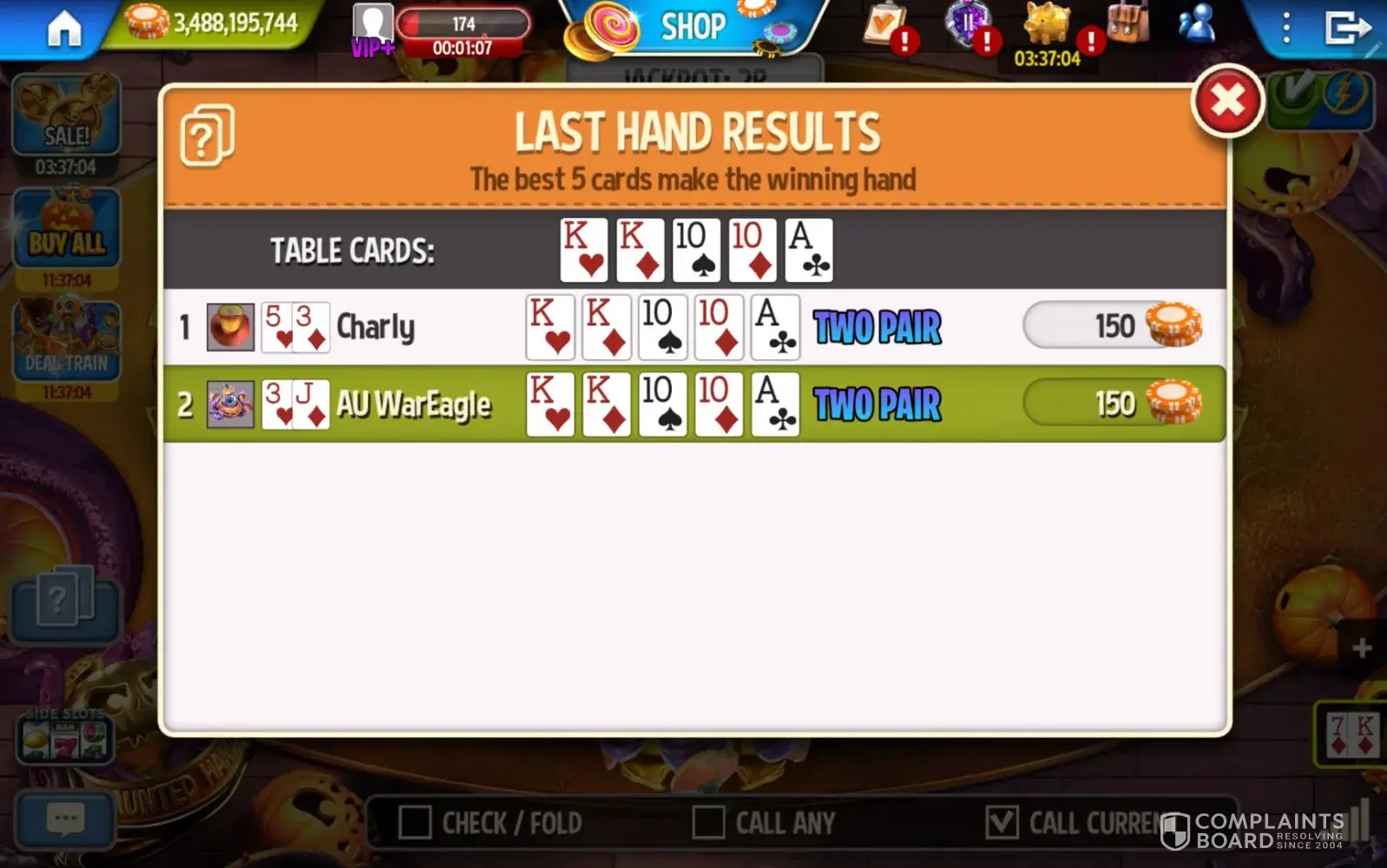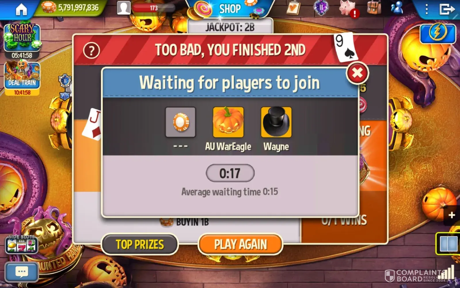 I spent $200 to prove a point, the first couple times you buy anything they throw you many win streaks to get you hooked. After a very short while they stop you from winning anything at all until your chips are gone. By the 3rd or 4th time you purchase something you’ll notice the win streaks come to a halt and the purchased stuff is gone quick. I decided to give it one last whirl 4/09 and purchased $24.99 ticket package, it’s the next morning and it’s gone. Blackjack is the worst but bad beats take your money in the tournaments, KK? theyâ€ll be an Ace everytime. I am removing this joke this minute, it is NOT real poker. Again April/May 2022, same everything except i spend a lot less money, 70 maybe, let me feel excited then get to 500 mil+ they’ll never let you win again. Play smart some purple player will go all in and force you to go in because you have a good pair or 3 of a kind, then get beat on the river. Recently the reception will disappear then boot me back in to see I’ve lost 1/3-2/3 of my balance because i was a robot for a minute so they got free hands then I lose immediately next hand. I’ve lost 30+ spin and win 10 mil buy ins consecutively or more. If this garbage stopped, I’d play in the summer and fall.