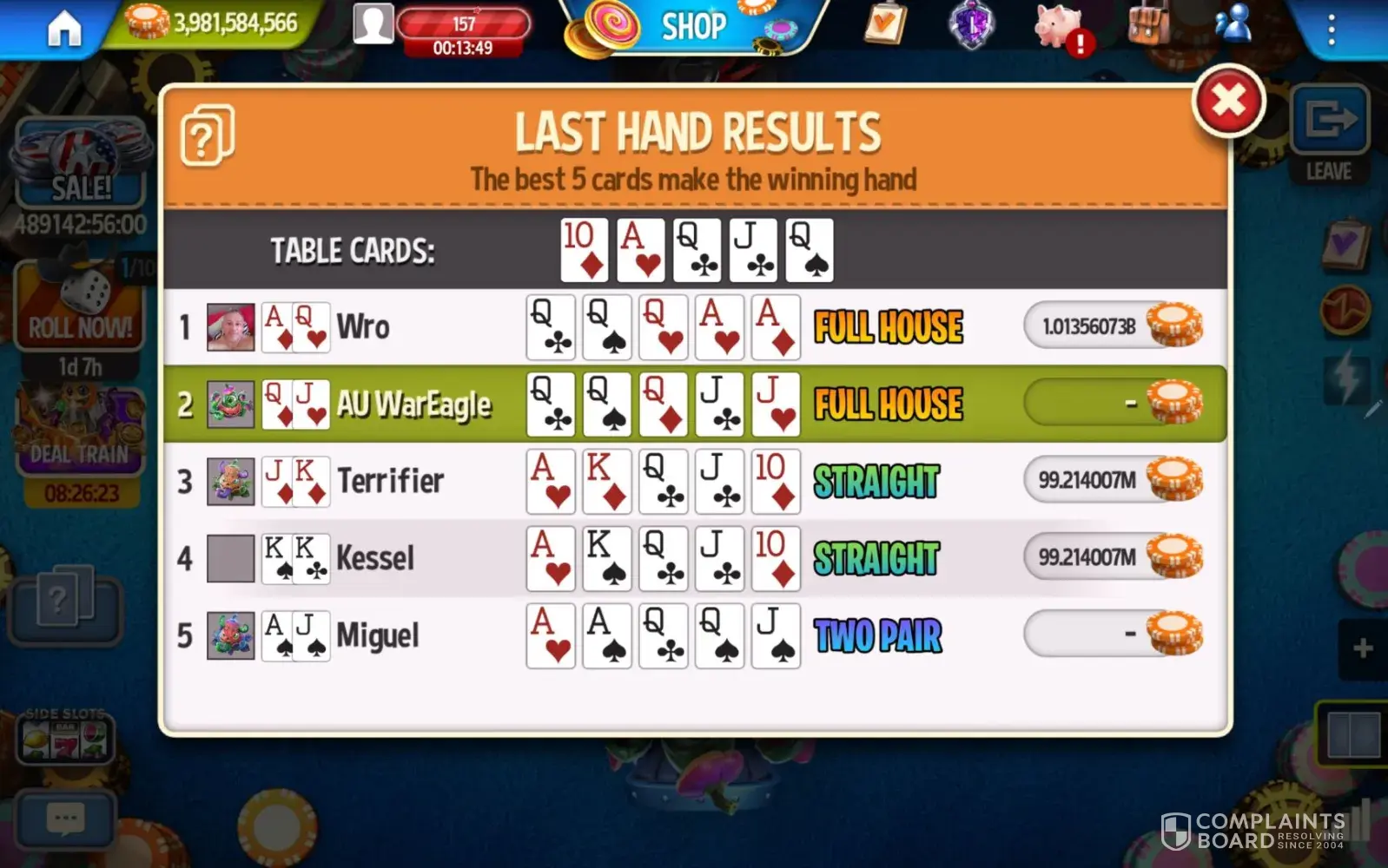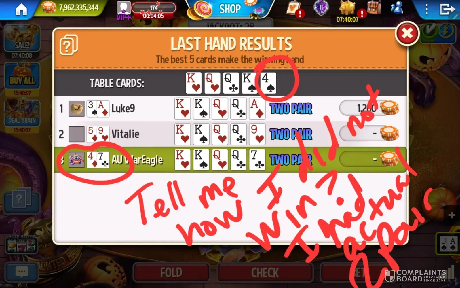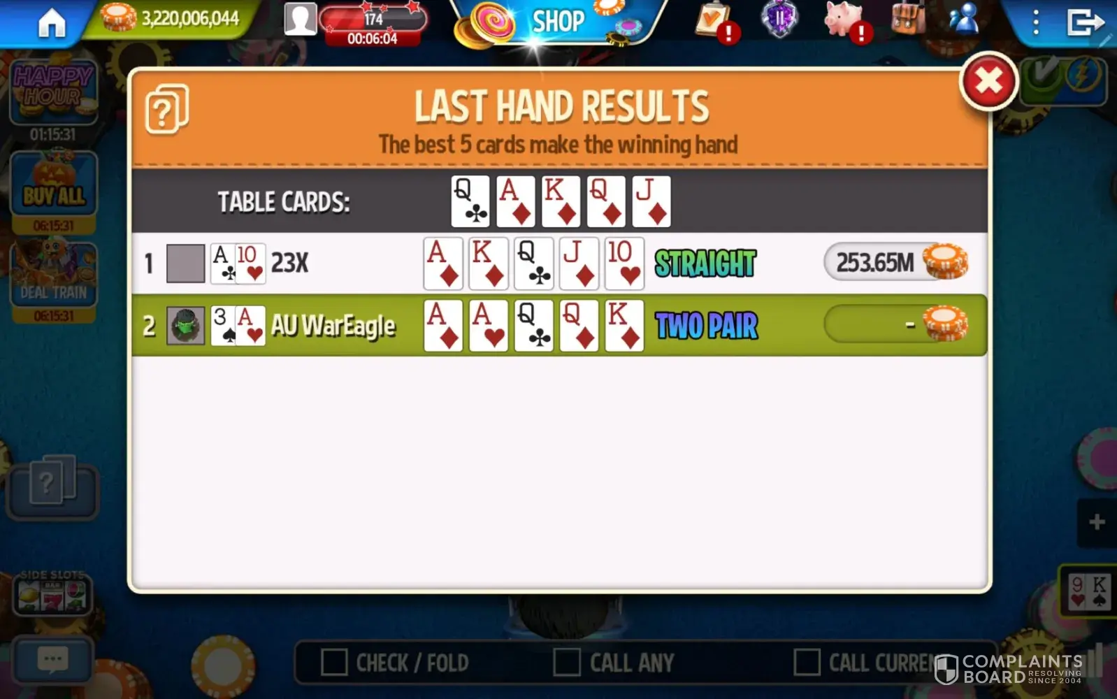 I have spent literally thousands on time on this game. It's only gotten worse. I have taken screenshots of the game landing on the jackpots then it will "land" on next lowest amount. I've been cheated out of 100 billion. The game dealer wins if it has 3club & queen heart but I'll have queen heart & 10 diamond in ultimate governor. But against other players I'd win. I play in actual casinos where Texas Hold'em was invented and this game has it wrong I want my money or my 100 billion chips I have purchased a deal where the minimum win GUARANTEE was 6 trillion and i DIDN'T GET IT. THEY CHEAT PLAYERS OUT OF MONEY