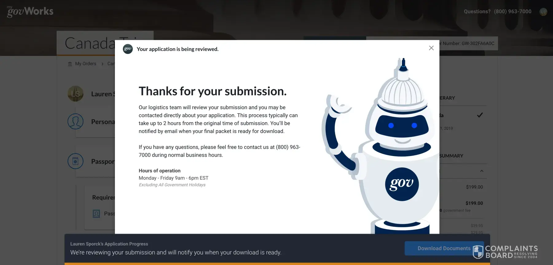 On Sunday, December 16th, I ordered the express shipping for my passport renewal (6-7 days) for $286.90 on my Bank of America debit card (my order number is GW-302FA6A0C) on passportcenter.com, a division of govWorks. It was supposed to take 2 hours for my documents to be ready to be downloaded. I'm STILL waiting for them. What a joke.