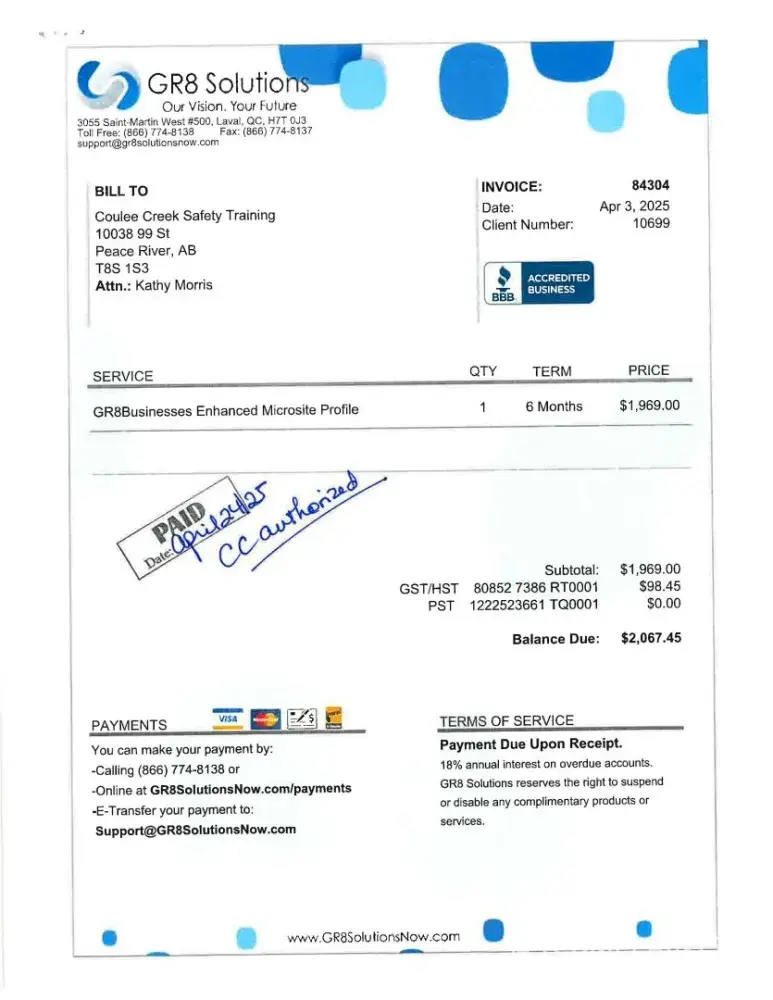 We have paid the invoices stating that its for 6 months. I paid and requested that this account be cancelled. They responded that its the last portion and it would be cancelled. In April 2025 I demanded that it needs to be cancelled and still they state its that last portion. June 2025 they took a payment off our cc without authorization, now we received another invoice to be paid. I have been trying to resolve this stating that we cancelled and April should of been last payment. He will not acknowledge the payment taken in June 2025 and will not sent me a receipt or copy of invoice.