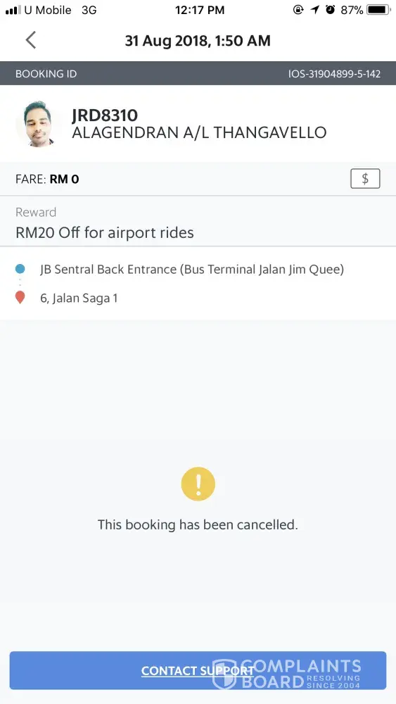I would like to lodge a complaint against a grab driver named Alagendran A/L Thangavello car plate number JRD8310. It was a very unpleasant experience with grab. As a frequent customer, I am utterly disappointed by the services provided to me by him. On 31 aug 2018, 1.50am, the grab driver was supposed to pick me at Jb sentral back entrance. After few minutes, he called me and saying that he will not getting any passengers after sending me home, he tried to negotiate for me to pay him extra amount of money instead of the price upront. I declined the offer by saying sorry and explained to him that i am a frequent grab customer and none of any grab driver ever tried to charge me doubled fare before. He started being rude and scolded me for rejecting. I requested for him to cancel the trip but he did not cancel. Instead, he came to the pickup point and waited. I approached his car, knocked the window and asked him bout the trip and asked him to cancel (as he stil want to charge me more and did not allow me to enter). Yet he did not cancel and started to shout and started swearing and cursing me. He even threatened me. I went away to a safe spot and cancelled the trip. This behavior is extremely disrespectful and I am beyond disappointed by his behavior.