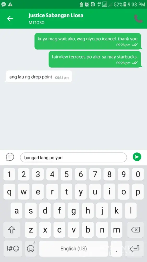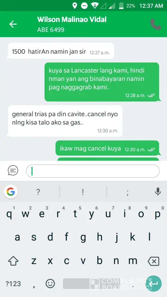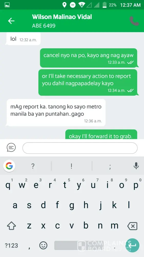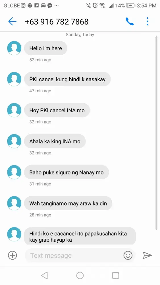 We booked at around 1:57pm and it showed that he is 2 mins away from where we were. When it became 1min away, we are trying to call him several times but he is not answering our calls. We instead, sent him a message in grab app asking him "nasaan na po kayo? " and he replied "nagmamadali kayo sir? " then we replied "yes medyo" because we are about to meet someone in la nueva supermarket. He then replied saying that hindi naman instant pagkabooked eh makakarating siya agad sa lugar namin kung ganon e ka cancel na lang nya, then he cancelled the booking.