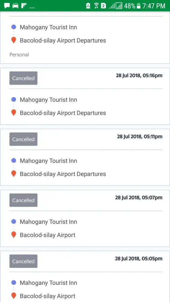 bound for airport in bacolod, 1st booking asked me to rebook for driver was too far away, rebooked again and the 2nd was stuck in traffic so he cancelled, 3rd and 4th accepted and cancelled. they should not have accepted in the first place, esp since had to find a sure transpo so i wouldn't be late, pls implement necessary measures, see attached ty