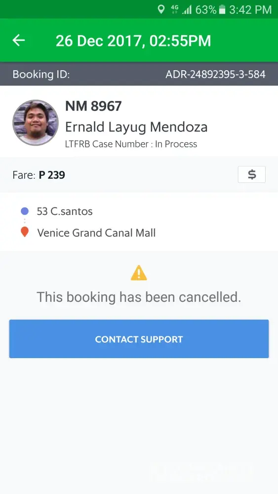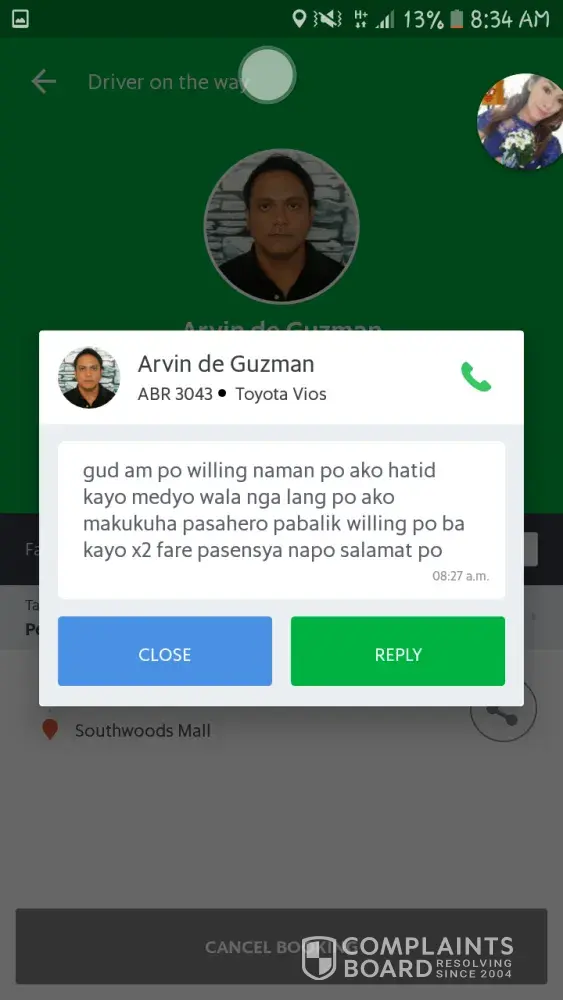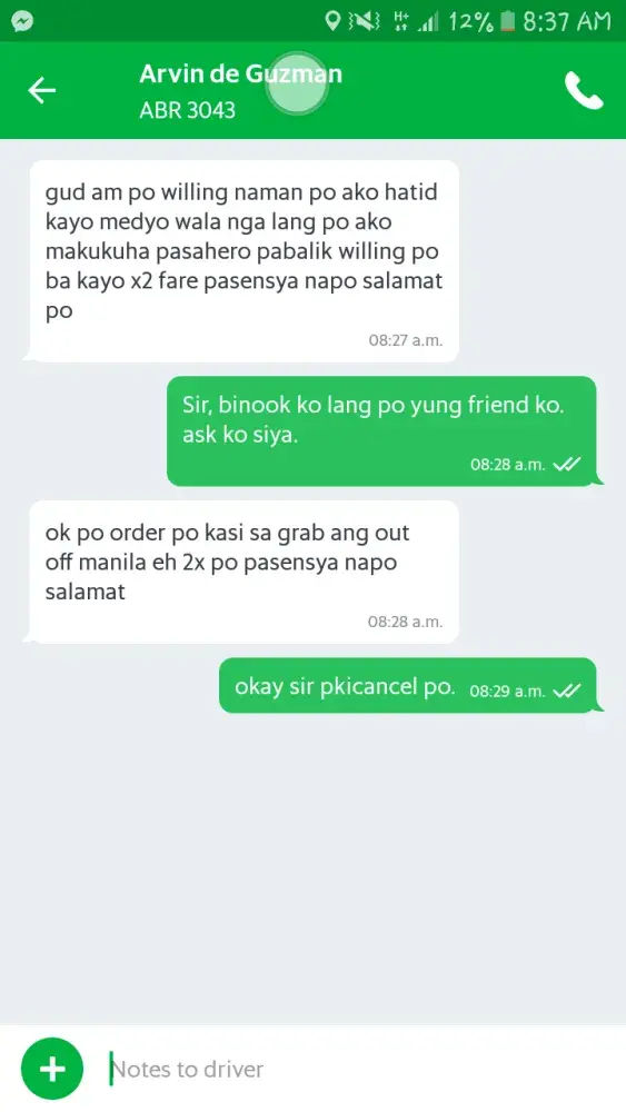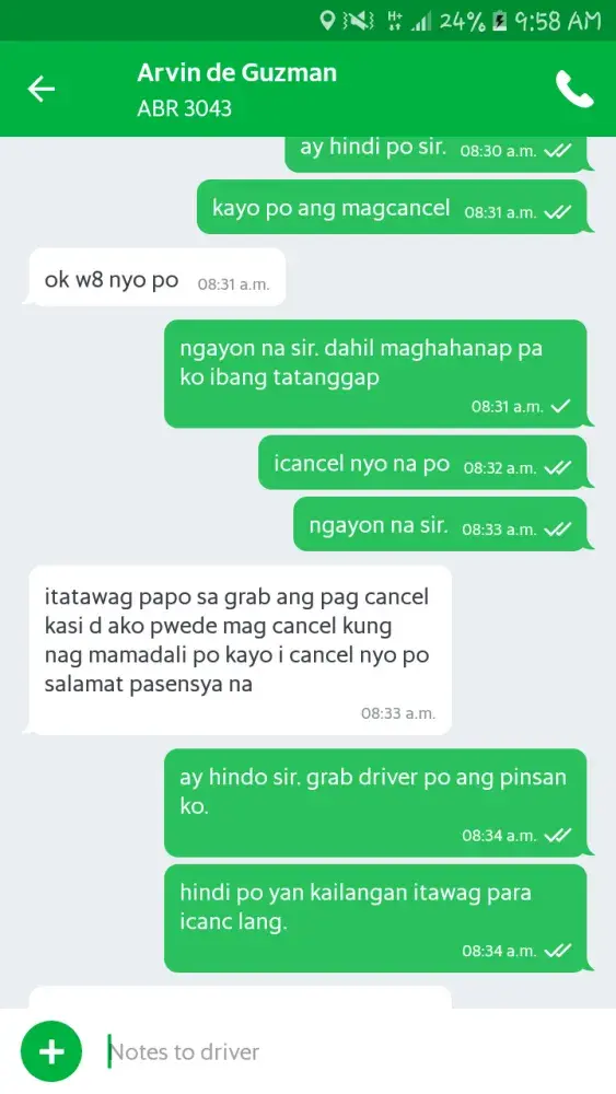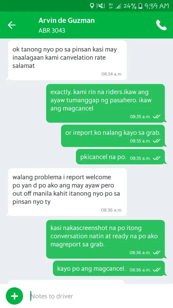 GRAB Driver: Arvin De Guzman of Toyota Vios ABR 3043 accepted my booking for a friend From Manila To Southwoods. He then sent a text asking for us to pay x2 of the original fare because accdg. to him he will have a hard time finding passengers in Southwoods. So, we declined his proposition and asked him to cancel the trip but he doesn't want to. He's insisting that I should cancel it because he needs to call GRAB before he can cancel — which is absurd! I dont want to cancel because it will affect my cancellation rate. I was polite with him initially but he is just unbelievable. He is even telling me that it is GRAB's policy that if the booking is outside manila the fare should be x2. Is that true? If it is then why we (the riders) didn't receive that announcement for us to be aware? This Grab Driver is just merely unbelievable!