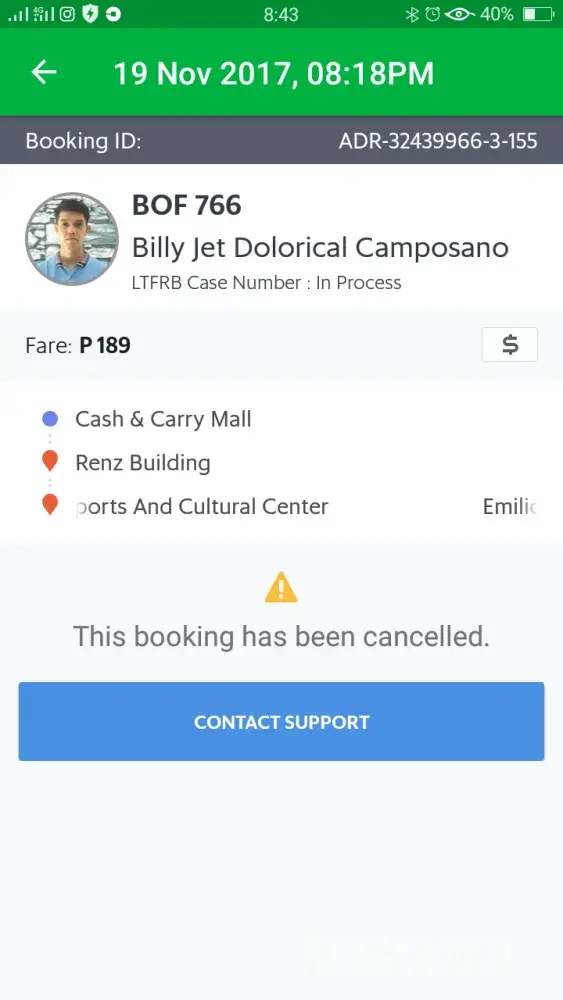 A cancelled trip from Cash and Carry Mall, Makati to Renz Building, San Andres to Emilio Aguinaldo College, General Luna. Ermita Manila at around 8:18 pm