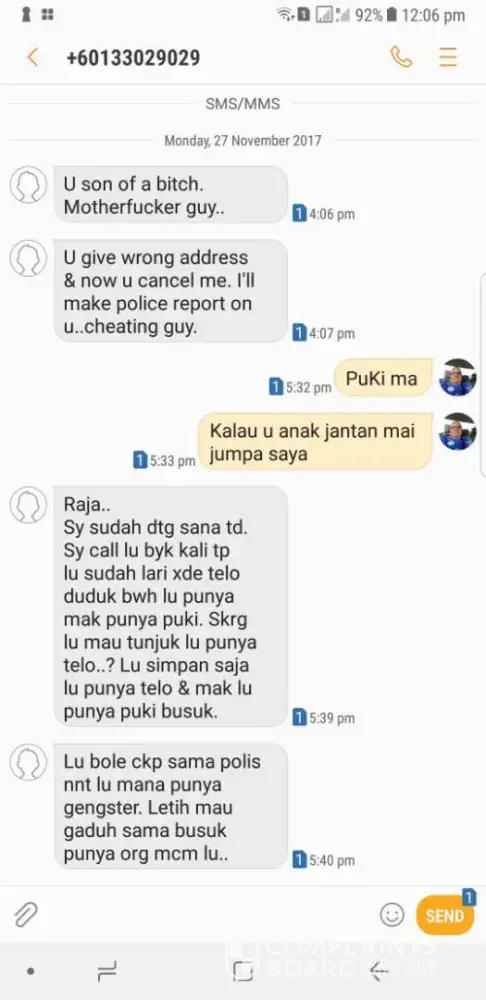 Hello good afternoon grab services, Yesterday around 4 pm something I have been booked a grab car through the application, unfortunately the driver not arrive on the time whereas I call the driver once I saw the status arrived but then the driver keep on drag me over here there and make me ids pointed due to I'm one of the well known company CEO and I cancel the booking and he send me a vulgar word towards me and kept sending the text message, herewith I provide the evidence of booking and cancel trip with the text message send by the driver.