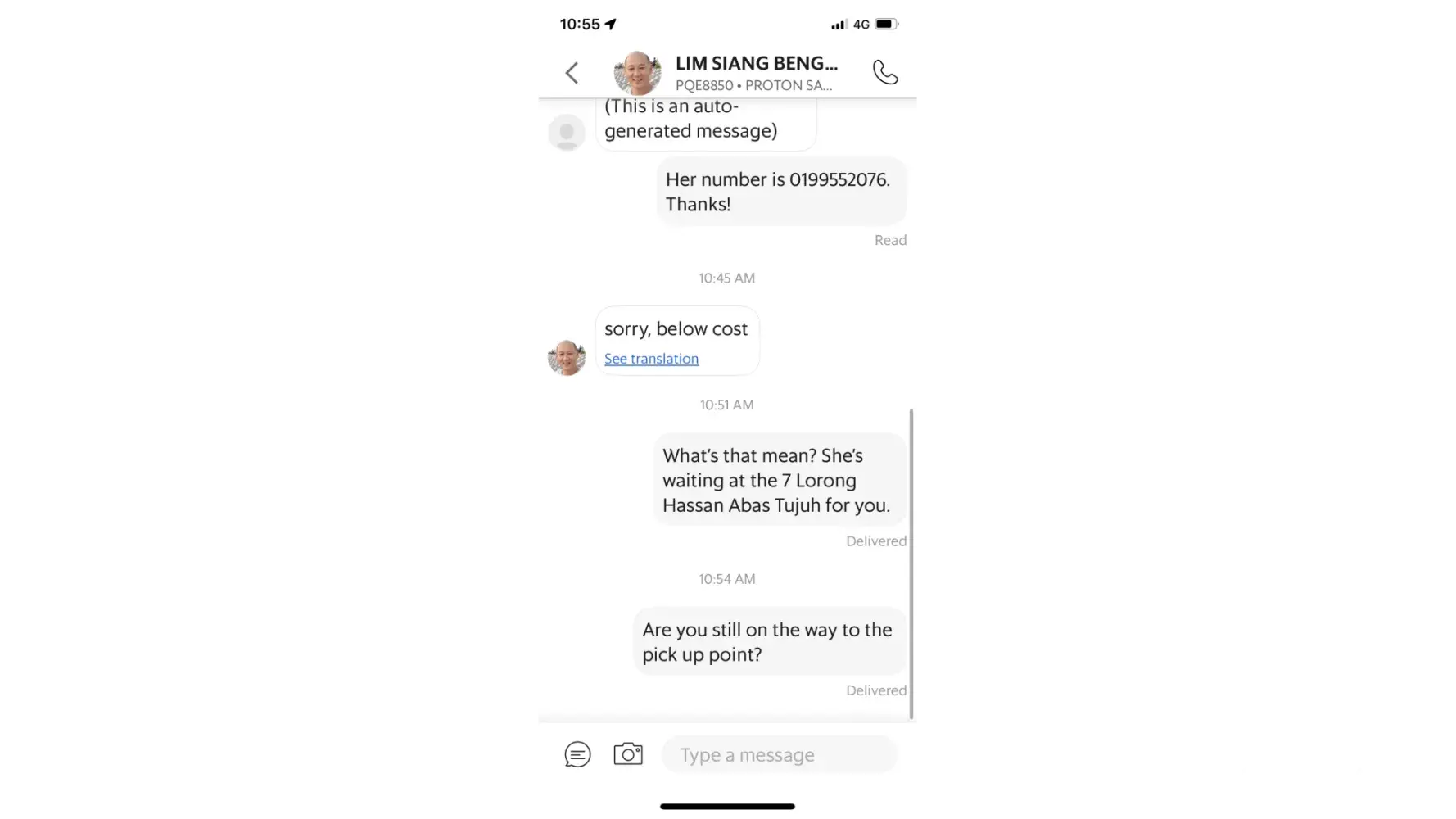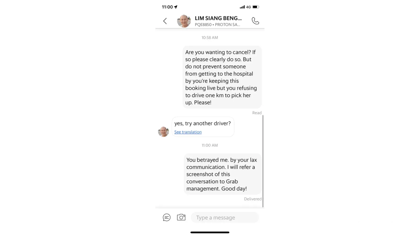 Finally she had to cancel and consider walking to a bus stop. I remotely ordered a Grab car to pick her up. A driver very near to my wife's location almost immediately accepted the job and my wife prepared to go with him. But after many minutes he too had not moved. He WOULD NOT CANCEL, but sent a cryptic message merely saying, "Sorry, below cost." What was that supposed to mean? I didn't know. So, I inquired. After more time and repeated message with the Grab driver not canceling, he said, "Yes, try another driver." See attached screenshots of the message exchange below. This feels very much like customer betrayal.