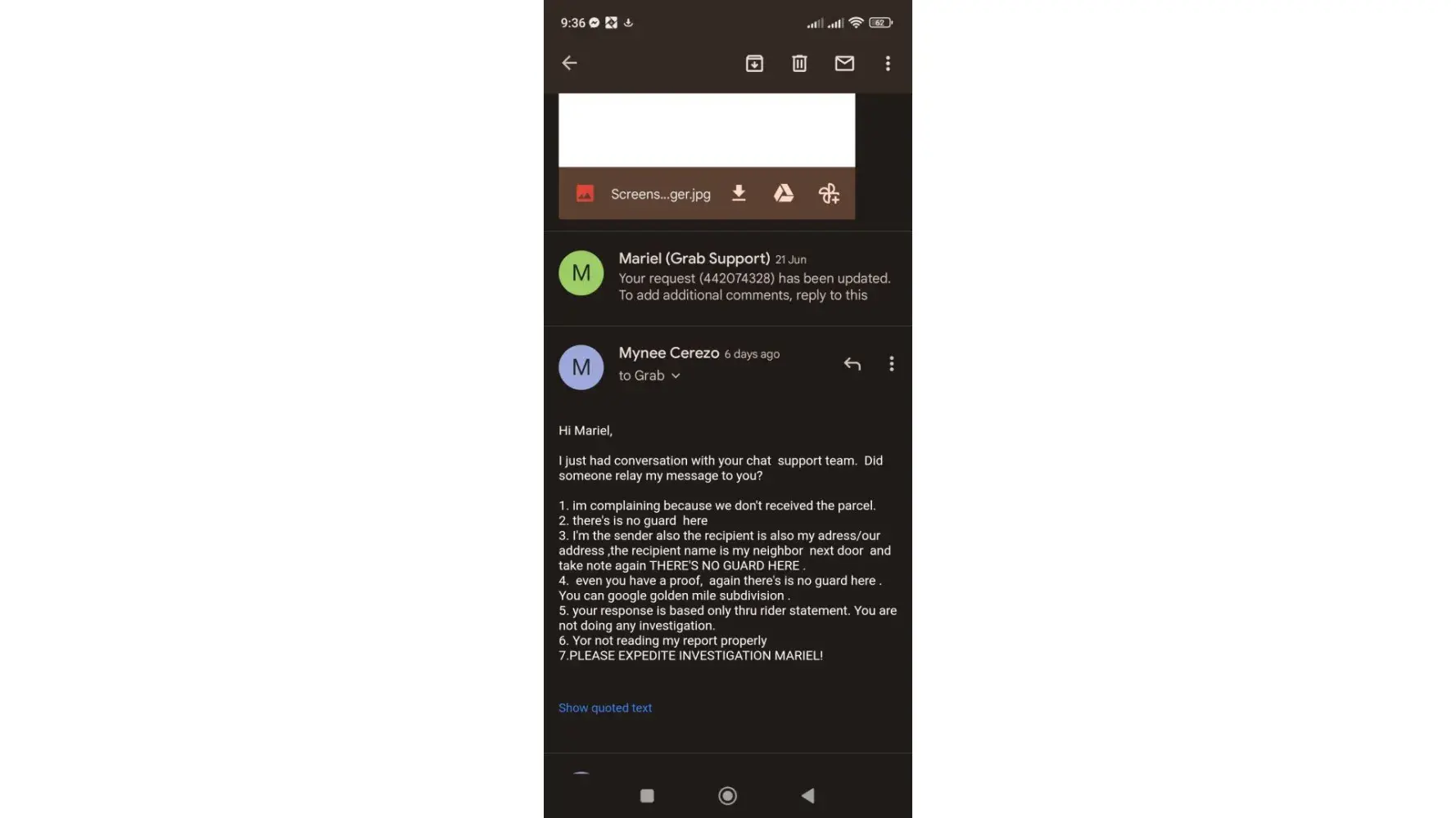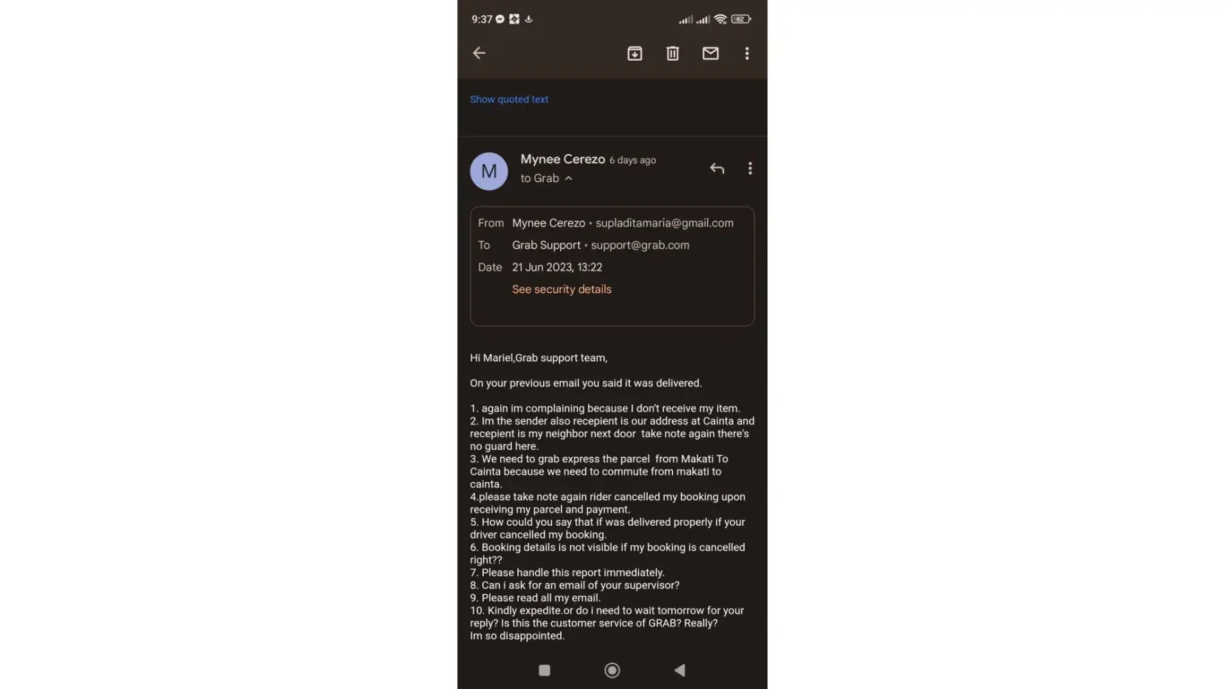 Last June 19,2023 We booked grab express from my Aunt's Adress from Makati to our address to Cainta . We decided to grab express the parcel so that is not hassle to commute from Makati To Cainta. Upon the rider received the parcel and payment he cancelled our booked. already reported it but no action from grab support the ticket number is [protected].