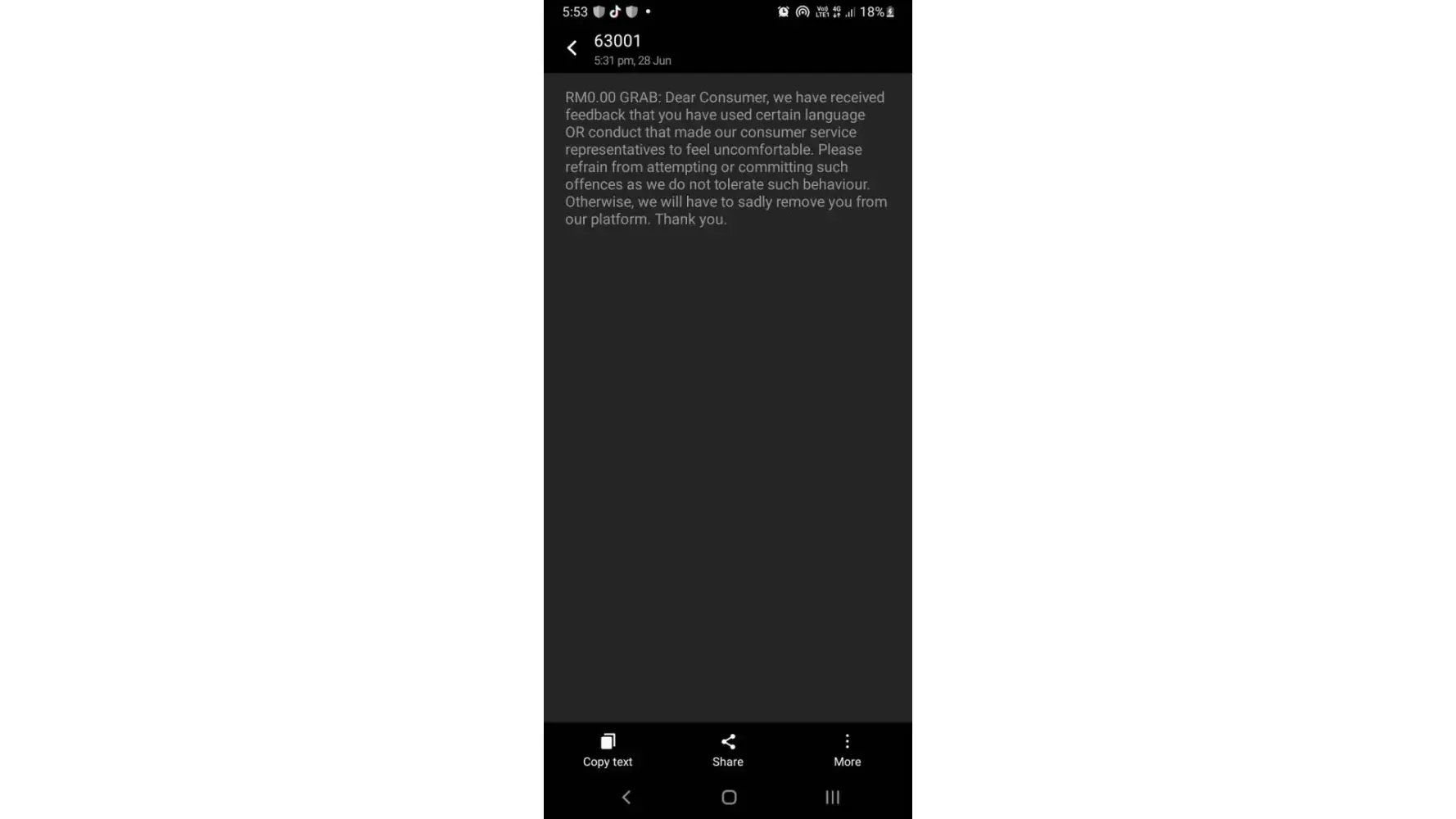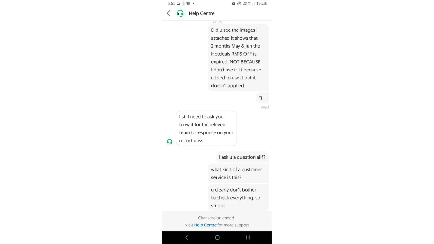 I received a text messages from Grab saying that i used abusive words. I want to say that I did use some abusive words like (stupid, slow as [censored], [censored]). I will not deny any of that. What I'm frustrated about is the fact that Grab has responded to my report a week after it has created. It was created on 15 Jun. I got a respond from their email department asking the same images that I have informed the previous agents to attach it in the report. I expect them to go extra miles and check everything from the chats conversation. I wasted my time to chat with Sara, Aliff & Dian just trying to understand about the benefits of GRAB UNLIMITED SERVICE. But, none of them tried to explain to me clearly on how to use it and all of them keep repeating the same thing that they will escalate this to the relevant department and ask me to wait. First of all, no notification sent to me confirming that the report has been escalated. Then, i contacted back and got so frustrated with Aliff because he keeps on triggering me. He keeps asking me the same images i have sent to the previous agent. And again, I've been asked to give again the screenshot of evidence that shows why the voucher from Grab Unlimited hasn't applied to my order. I sent multiple images from the Reward section and from the checkout page. And now that it's over, I made a complaint and ask Sooriakumar to created a complaint for these 3 agents. But he ignores that request. So i sent a feedback from the Help Center option, and today, I got a message saying I have intolerable behaviour. Put myself in your shoe, receiving a slow reponse from your customer service agents and not getting clear information on the services you have provided. Furthermore, the issue you had with Malaysian rider versus Singaporean citizen that happens recently, indicates how ignorance GRAB can be. No matter towards to their rider, but towards their users as well. I will stop using Grab and and will share this ridiculous experience to everyone i know. I understand Grab is trying to be extra protective to their agetns. But i need Grab to understand why i reacted the way i did is because your services is very poor! I've been working as a customer service for 7 years and definitely I understand the feelings being an agent. But this is not a personal attack but more like a frustration to the lack of understanding & communication from your end. I have been loyal to Grab since 2016 until now and i got nothing in return but a being accused as an abuser by Grab. Fantastic! GOODBYE GRAB!