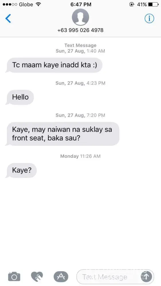 This grab driver looked for me on facebook in attempt to add me as a friend. Also, he tried contacting me through texts multiple times. He once asked if the comb that was in his car was mine. I was pretty sure I didn't leave anything in his car, which resulted me into thinking that he only said that to get a reply from me. Attached here are the photos of the facebook profile of the driver and his text messages.
