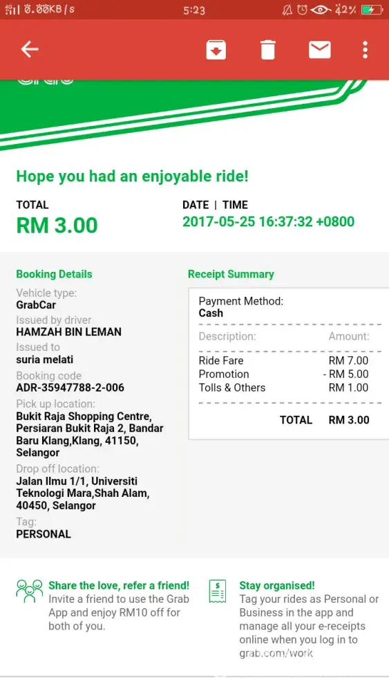 Yesterday i took a grabcar and its cost totally rm8 including toll charge. But somehow i got promotion RM5 and he knew about it! When my friends and i reached our destination, he took RM8 from us and ignoring the promo! I want my money back. 😔 As a student, we took the grabcar as our prior to reduce our cost but this what happened. And the smell of his car also so smelly and i feel so dizzy when i was in it. Pls take more cautious bout ur driver.