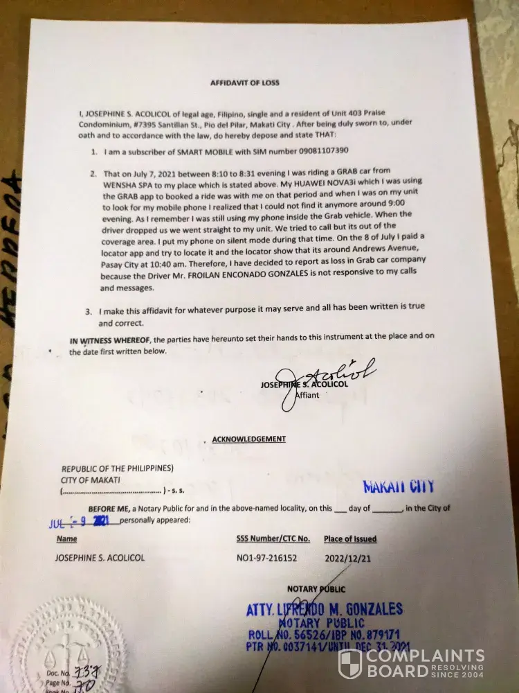 I booked a ride on July 7, 2021 from Wensha Pasay, the driver Mr. Froilan Gonzales pick us up at 8:10pm & we arrived in Santillan Praise Condominium at 8:31 we were 3pax my son was seated Infront & I seated at the back together w/ his GF, during our ride I collected the money the they owe me so, I used my phone Huawei nova3i calculator . I also grab my wallet from the deepest part of my bag so, I can put the cash . Then we arrived went straight to our unit . I was sleepy from the massage so, I relaxed for awhile before I gather my stuff in my bag I was looking for my phone & we found out past 9pm that night we called but out of reach & my Son also tried to locate via my Google acct but we failed.. we are not expert on this because it never happened to us. I panicked, because I have all my bank details, credit cards, photos, documents for work. That phone is my life & my work . As a freelance real estate agent my listing, clients contact is very important. Eventually, I found a way to log-in to my Grab acct then email a complaint on Grab help, Grab said that w/in 12 hrs I must contact the driver to retrieve the item. So, I called the number registered on my grab history, but the driver didn't reply or answer my call. So, we look for him on Facebook & we found to accts. I sent a message in Fb messenger of the driver but he replied on the 9th of July . After I had filed a police report as grab asked me to do & send it to them via email . The driver said that he was sorry, he forgot to check the back seat because he got another passenger right away after he dropped us off & he also ask the passenger next to me & his reliever driver no phone was found . I also paid a tracker app to locate my phone it was somewhere in Pasay . Surely, it was now stolen. Because, all 3 of us passengers are just in Makati.