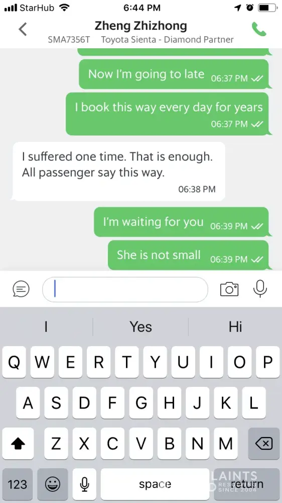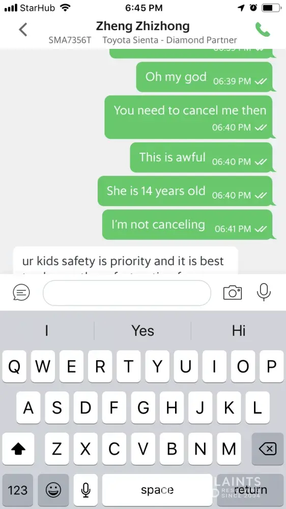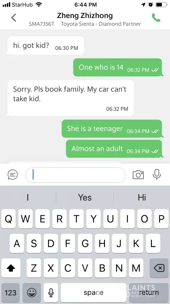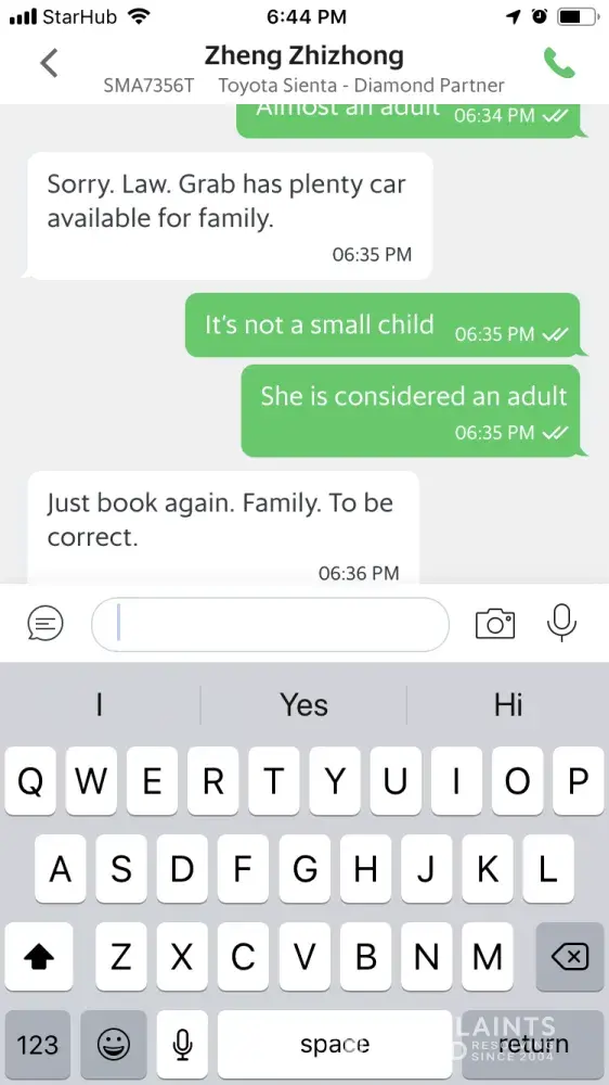 Driver was refusing to take me and my 14-year-old daughter insisting that we get a Grab family instead of a Grab car because of her being a kid. Insisting because taking a 14-year-old would be against Singapore law. He would not cancel and it is now five minutes before my dr appointment that will cost me $250. I am very very late. I am in tears I'm so upset.