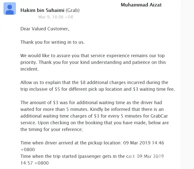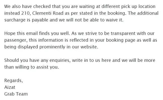 I went to check the terms and conditions. There's only surcharge of $5 for every 5 min late (after 5 min grace period) and no surcharge for booking from wrong location. No information found on surcharge for wrong location (Grab app detected my location wrongly to begin with). (attachment: Screenshot of Driver Waiting Time Conditions by Grab)