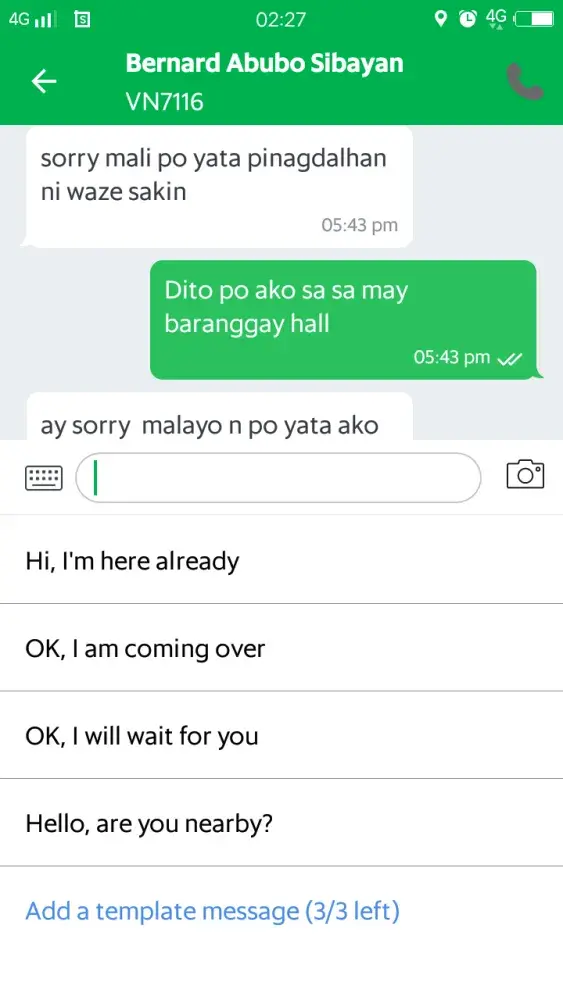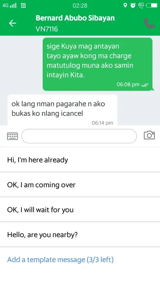 September 29 I book grab around 5:35pm at Rosario baranggay hall and VN7116 (Bernard abubo sibayan) accepted it so after few minutes I asked him if he's nearby because I saw he's not moving but I know he's not so far from where I am so I played games on my phone while waiting then I check the app if where he is and I was shock because he already pass from where I am and too far then he message me that waze guide him in wrong way so I asked him to cancel it so I can book another cab and he told me if I'm in a hurry I should be the one to cancel it... I Dont want to cancel because I don't want to be charged so I waited and I can see that he's not moving from where he is and until now it's 3:00am he's still in the same place and he's not cancelling the booking he also told me he'll be thankful if I report him to grab because he'll have reason to leave. I don't want to encounter grab driver like that anymore I am a regular customer I have to ask my friend to book grab for me so I can go home I cannot book because until now he's not cancelling the booking and I don't want to cancel also I want him to learn his lesson.