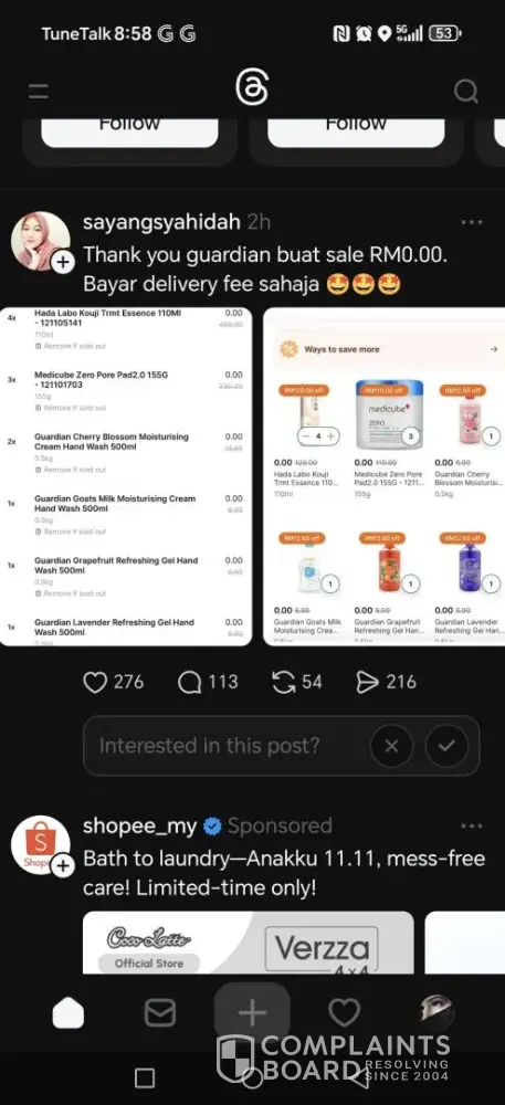 Dear Grab Support Team, I would like to report a possible system glitch on the Grab app involving items listed under Guardian. I discovered this issue on 6 November 2025, around 8:00 PM, when I opened Threads after returning from work. I noticed several posts showing Guardian products being sold at RM0.00 after discounts. At first, I thought it was a...