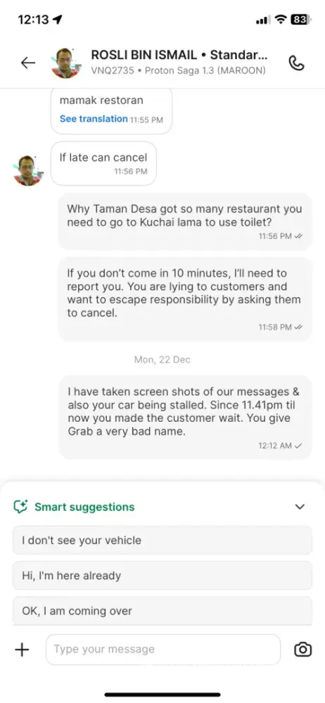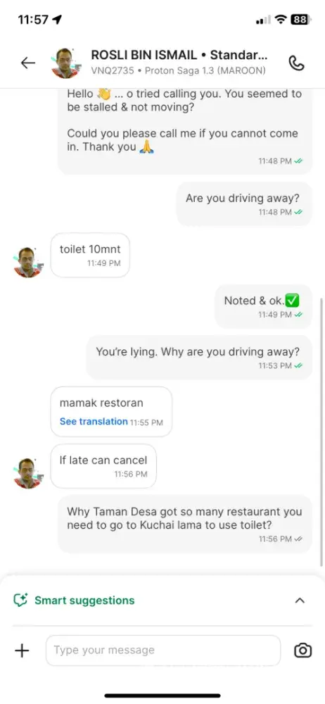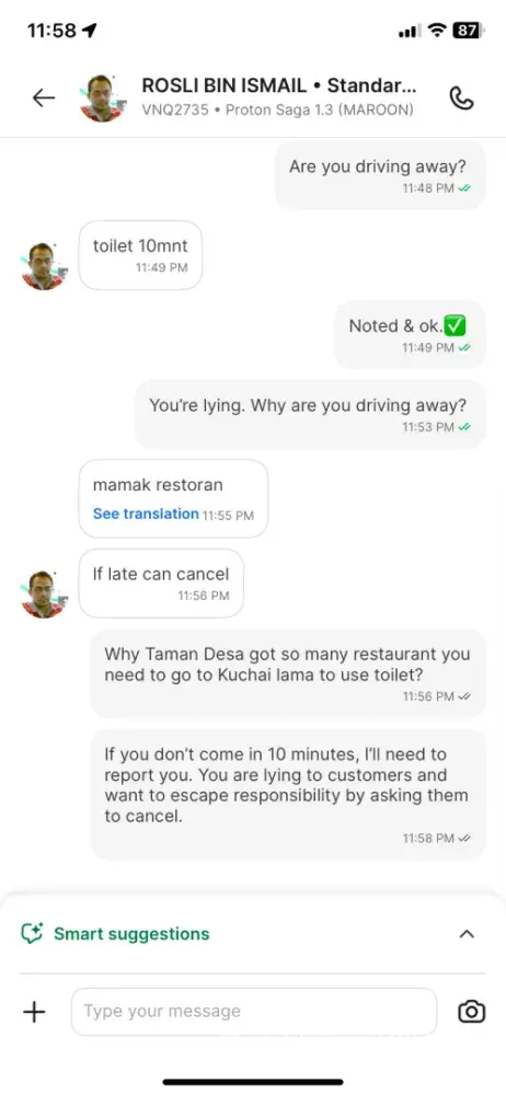 I am complaining about a driver Rosli Bin Ismail who lied and made me wait for hours