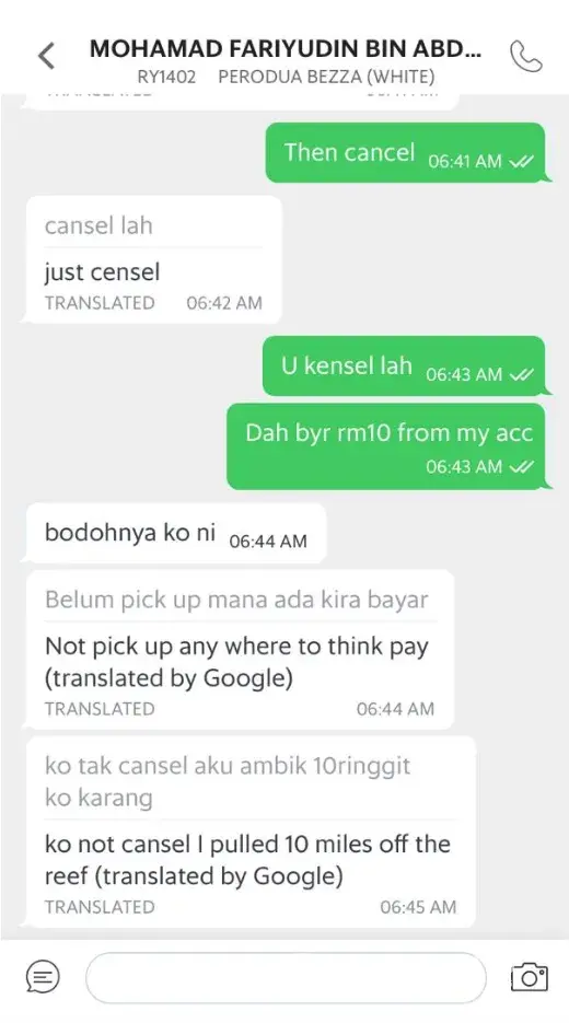 I told him i am using my grabcash and it shows deductions of RM10, he called me bodoh (stupid) and threatened to take my RM10 if i don't cancel the ride.