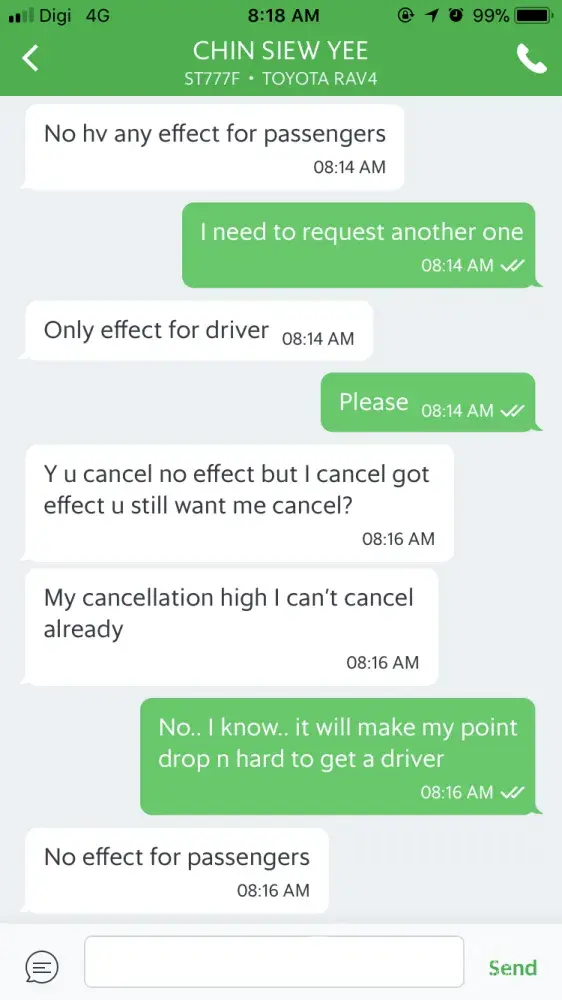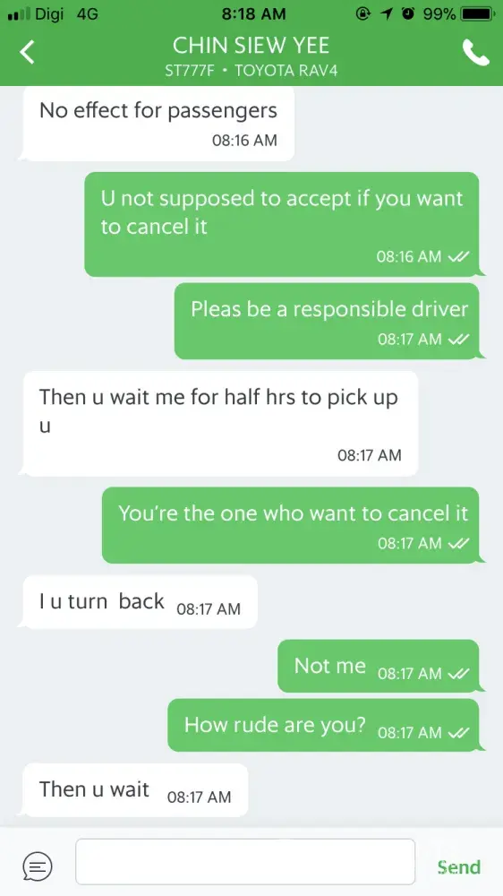 Today around 8am morning.. I requested a grab.. Few minutes later the driver texted me and ask me to cancel the trip since he's far away from my pin point.. So I ask him to cancel it since he's the one don't want to pick me up but he insisted me to cancel it because he couldn't cancel the trip due to his cancellation is high.. So? It's mean he cancelled quite a lot right? Why did you accept a trip if you're going to cancel it? So a grab driver can choose a trip as they want? What kind of service is that? The gps showed he going way further from the pin point then I asked him to cancel it so that I can request a new driver but he didn't. He even told me to wait him for half hour to pick me up if I don't want to cancel the trip. How rude? This is treatening. Again, what kind of service is that? Ruined my morning!