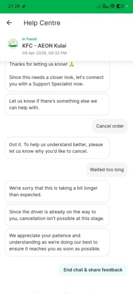 I then contacted Grab and clearly requested to cancel the order because of the ongoing delay.