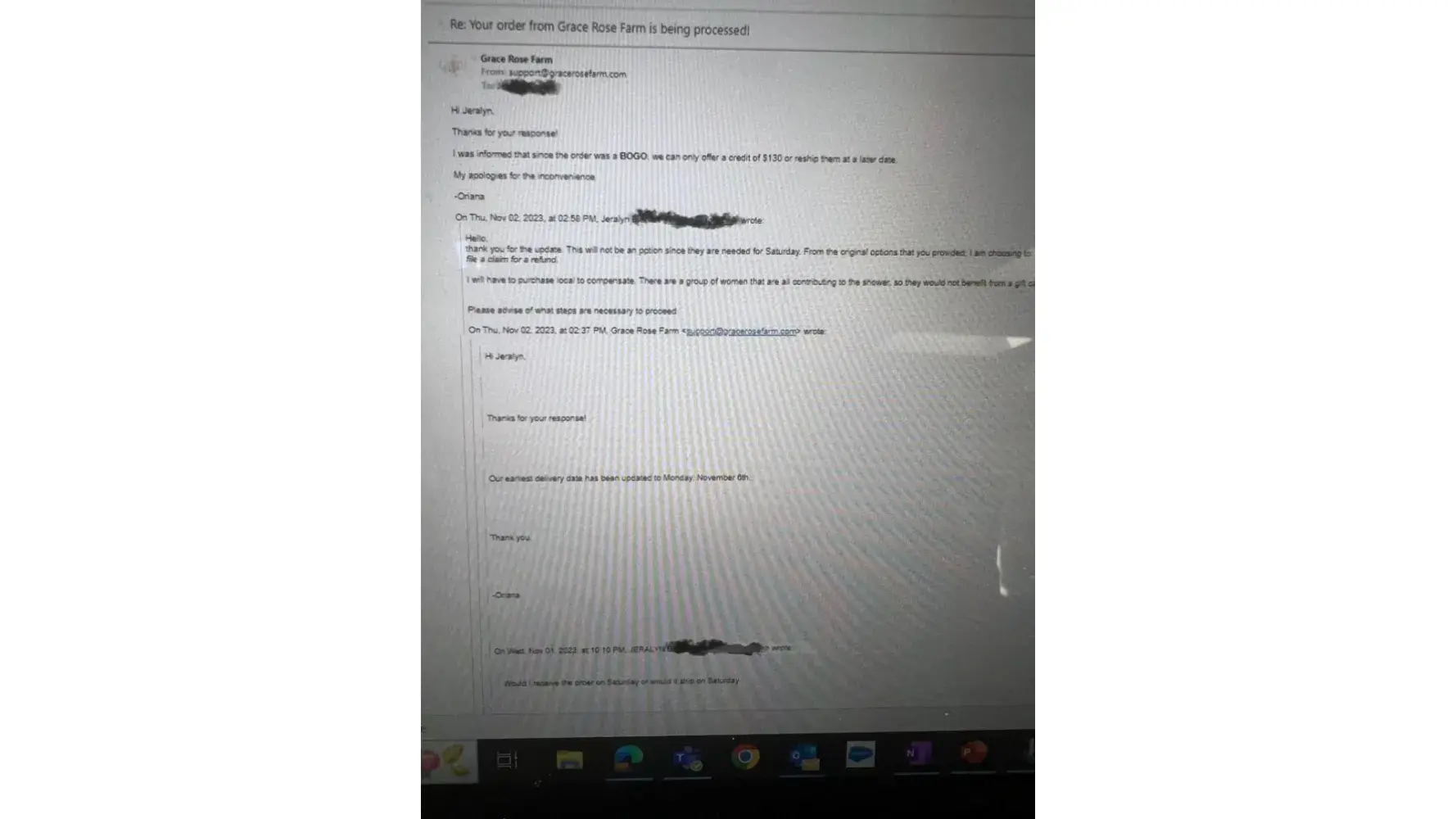 I paid for a flower delivery service to arrive on 3/17/2022. The flowers didn't reach the person I wanted to send them to. GraceRoseFarm doesn't give customers a phone number. Their customer service only uses email, and it's been going on for 2 1/2 weeks. As of 3/31/22, Grace is still ignoring my requests to resolve the issue over the phone. They don't want to give me a refund. The flowers were supposed to be delivered to an office, not a house. UPS says they dropped them off at 8pm, which is after work hours. The doorman doesn't have any record of the delivery. UPS didn't get a signature confirmation. I emailed Grace right away, but they took a few days to reply and then asked me to do the work of finding the package. About a week later, Grace agreed to send the flowers again on a day I chose for business hours. But the flowers never came. I contacted them again, but they ignored my emails for a few days. Secretly, Grace tried to send the flowers randomly, several days later. They never told me when they would be delivered. I don't have any confirmation that the person I wanted to send the flowers to actually got them, but it seems like Grace picked a day when the office is closed. I asked Grace to call me, but they ignored me. I found a 805 phone number and left a message for someone named ***, but they haven't gotten back to me. I've been sending frustrated emails for 2 1/2 weeks. This business is supposed to deliver flowers for special occasions. Making sure the flowers arrive on the right day is part of their job. The original delivery date was 3/17/22, but they didn't deliver what they promised. Their customer service through email is basically non-existent. I've asked for a refund and a phone call multiple times, but they're ignoring my requests.