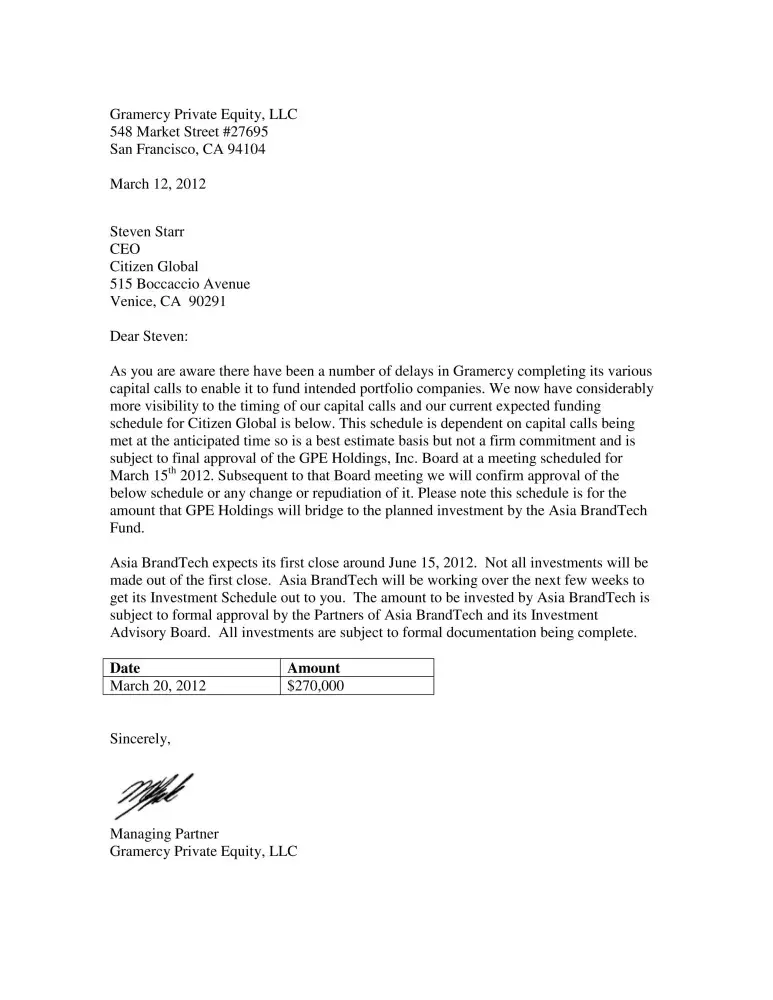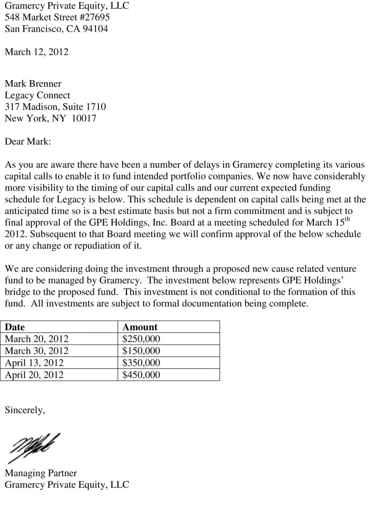 Michael Gale and his family stole hundreds of thousands of dollars in fees from clients, partners, investors and never delivered on one investment promise. Before the Gramercy Group web sites were pulled down, Gale stated he and his team were seasoned fund managers with over 30 years of experience, controlling 28 portfolio companies, totaling $50M in direct equity investments. Not only is this complete rubbish, but it can all be substantiated by contacting the CEO's of these companies, as our team did. Michael Gale lied, again, in order to solicit fresh money to fund his lifestyle. Gale took this behavior one step further when he issued funding promissory letters to companies expecting their investments. Gale used contractors like Bruno, and others, attempted to place blame on them because of his previous promises/lies. The reality is simple: PEGG, Angad Paul, Seven Hills (Dave Kattradaga) and Millennium were lined up as investors as stated in the series A terms sheet, which was then circulated to induce further interest from investors and partners. This was a feeble attempt to rob from Peter in order to pay Paul. This has gone on for years, without any evidence of successes, only a trail of collateral damage, bankrupt companies, divorces, and now long over-due criminal investigations that will result in Michael Gale being arrested, indicted and convicted.