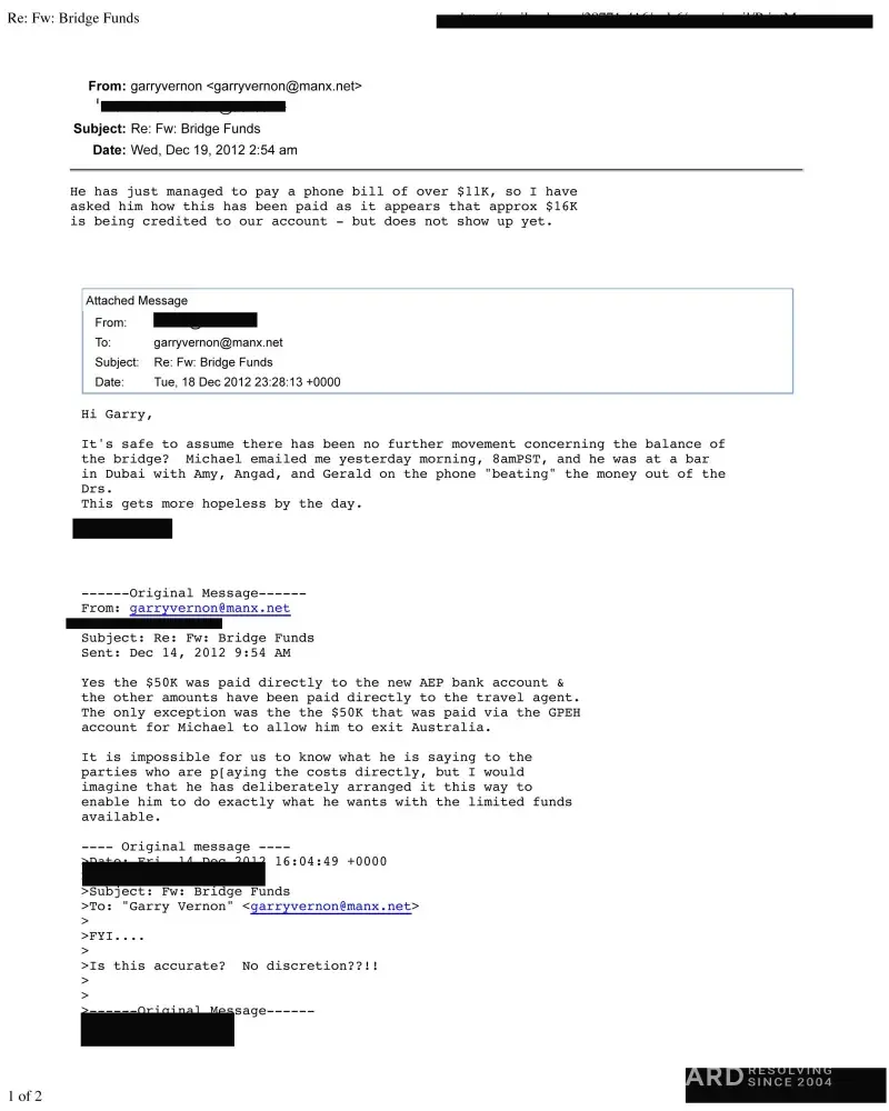 To add more texture to these statements. Michael Gale used investor money to satisfy fines in his home country of Australia. In this instance; $50, 000 was wired into a Gramercy Private Equity Holdings, Inc, Bank of America account. At this time, Michael Gale used that money to pay the Australian authorities so that he could have his passport re-issued. When the subject came up, Gale flatly denied having used these funds for his personal financial problems. However, this can be substantiated by the attached email exchange between Garry Vernon and a former Gramercy employee. Another successful attempt at misdirection can be seen in Gramercy Commodities. The UAE trading entity setup by Gale and his partners was nothing more than a shell organization brokering bogus oil trades. To date, over $4M dollars of upfront fees have been collected from unsuspecting investors, and not one oil trade has been consummated.