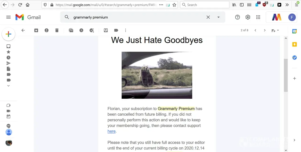 "XYZ, your subscription to Grammarly Premium has been cancelled from future billing. If you did not personally perform this action and would like to keep your membership going, then please contact support here."