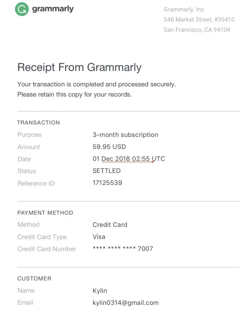 When I bought a month Grammarly I wasn't aware it was a subscription. It appeared to be a one off payment. However a month a latter I'm being charged. Like the previous comment I didn't receive any invoice or receipt a good thing I was altered by my bank. I trying to get in touch with Grammarly for a refund an I haven't head anything yet. It just seem very suspicious that they don't advertise this clearly or inform you they have deducted monies from you.