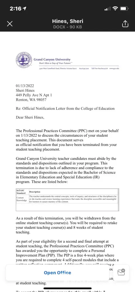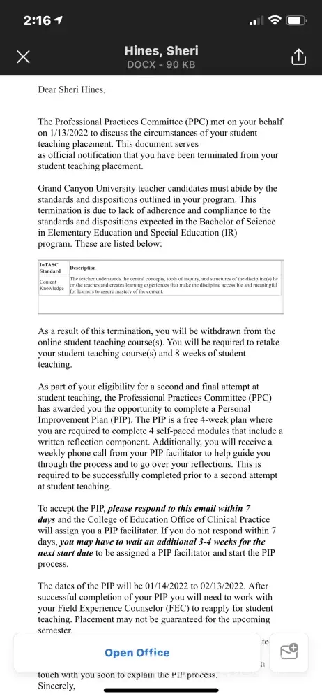 Not to mention I've already taken five months off of work for my student Teaching because you're not allowed to work while student teaching. My last paycheck was September 2021. Including the time I have to takeoff work to retake the class this is going to cost me about an additional $10, 000 out-of-pocket . I've have interviews lined up for next week for a teaching positions. If they would've simply looked at my response they would've seen that I did nothing wrong, allowed me to finish the course by doing my few days that I had left in another classroom! More importantly, I was put on the PIP plan Friday. Monday she says my lesson plan was great. Monday afternoon she approves Tuesday's lesson plan then decides to email me after we've already left work then allows me to do two lessons before coming back into the classroom with the principal and the assistant principal telling me they're terminating my placement Because I didn't respond to her email. Here's the funny thing. Lesson plan that I did turn in if you look at dresses the email! She clearly didn't even look at the lesson plan that well because everything she asked in the email was already in the lesson plan!