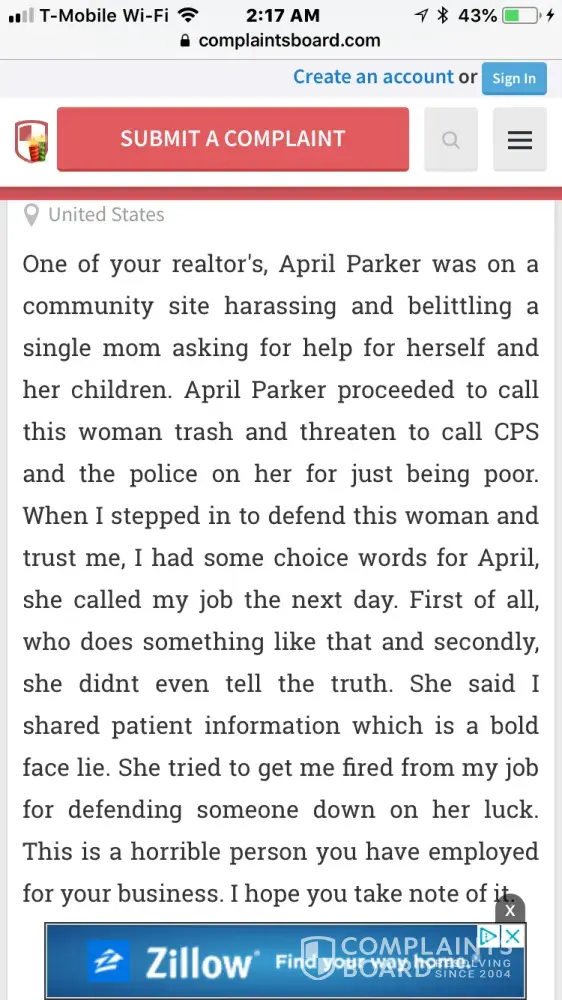 One of your realtor's, April Parker was on a community site harassing and belittling a single mom asking for help for herself and her children. April Parker proceeded to call this woman trash and threaten to call CPS and the police on her for just being poor. When I stepped in to defend this woman and trust me, I had some choice words for April, she called my job the next day. First of all, who does something like that and secondly, she didnt even tell the truth. She said I shared patient information which is a bold face lie. She tried to get me fired from my job for defending someone down on her luck. This is a horrible person you have employed for your business. I hope you take note of it.
