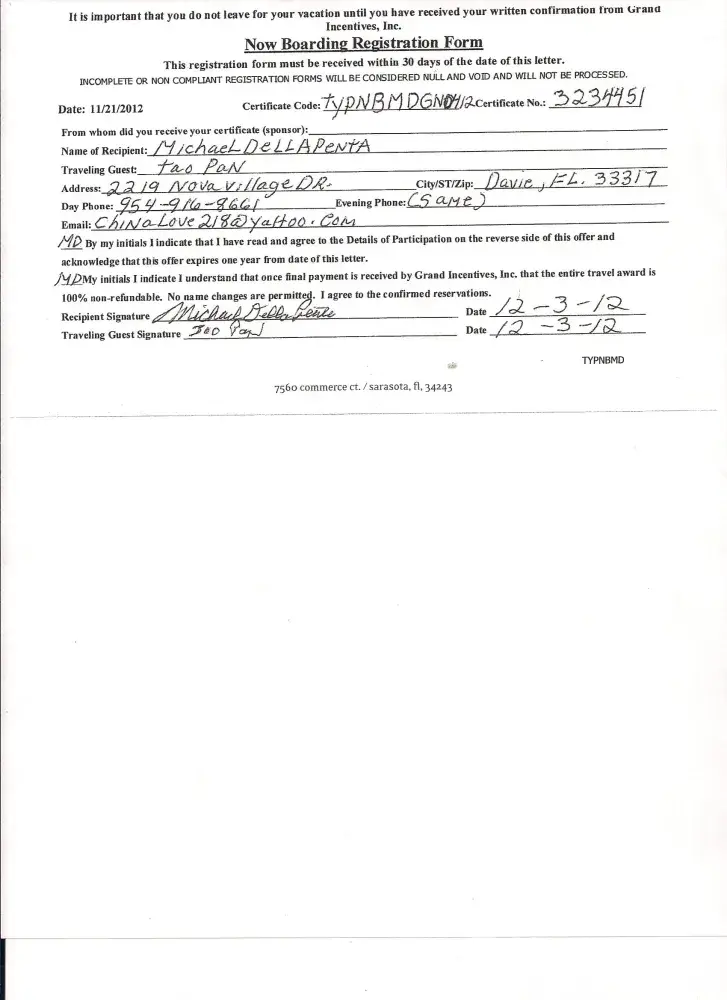 I completed their forms and sent the money order. Our trip was voided! They said our form was not completely filled out. I tolded her the only fields that I didn't complete was the fax number because we don't have one. She told me that I should have put NA, none or a line thru it! I told her there wasn't anything indicating that I needed to put NA, none or line if you don't have a fax number. She said it doesn't matter, the form was not completely filled out and I should have read the instructions! Really? they voided the trip because of that? Rediculous! They returned the money order but now I have to pay $15 to get it refunded which can take up to 30 days. They make it almost impossible for your to get the FREE trip which of course isn't free because you have to pay the $50 per person processing fees plus taxes, port fees or whatever other fees that get tacked on.