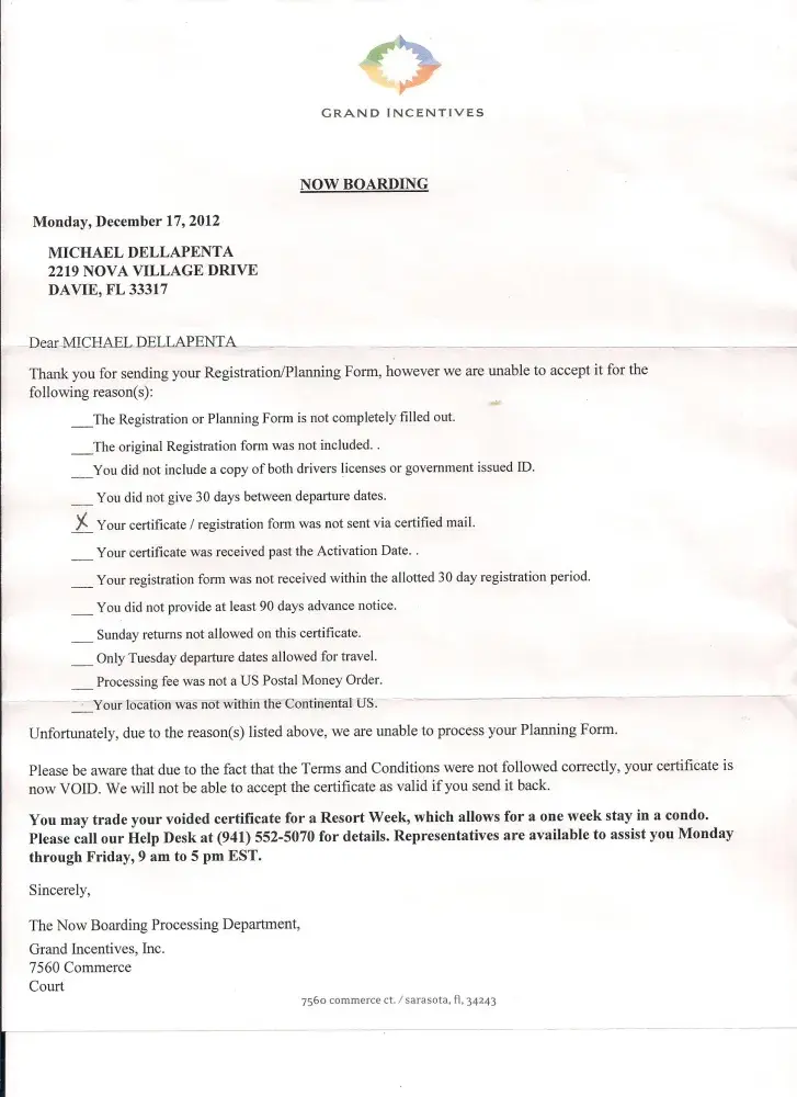 We applied for Now Boarding airline tickets at $50 each. The tickets were offered as an incentive to attend a Vacation Club presentation, which we did. We were required to submit 3 separate travel dates within highly restrictive parameters, a postal money order, and copies of our drivers licenses. We met all time limits and submission requirements. We received the attached rejection letter stating that our registration form was incomplete and that our certificate had been invalidated. The only items not filled in on the form were "Business Phone" (we are both retired) and "Fax" (we do not have a fax machine). Attached are copies of our registration form and the Now Boarding flyer (Item 2. There was no legitimate reason to invalidate our certificate.