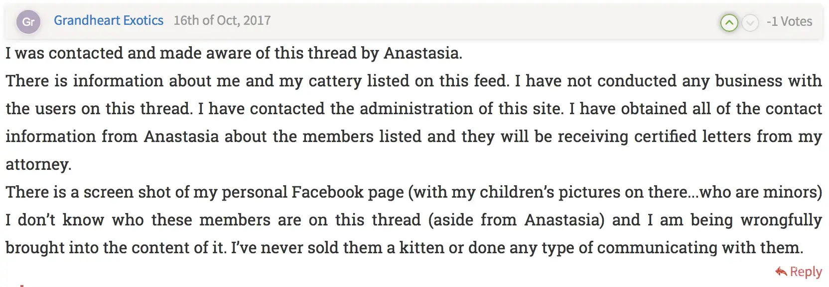 We’ve never spoken before and I’m sure that you haven’t purchased a kitten from us. You are welcome to contact us at any time about our kittens. Unfortunately anyone can register and write anything they see fit on this board whether it’s truthful or holds any merit...as you yourself have just done. We have an outstanding reputation with many happy homes to verify that and not just hear-say posts. Have a nice day!